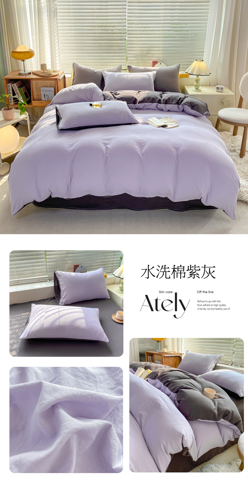 当前位置: 91家纺网 > 商品网购 > 床品套件 > 四件套 > 水洗棉四件套 > 雨帆家纺 2024新款简约亲肤水洗棉双拼四件套 水洗棉紫灰