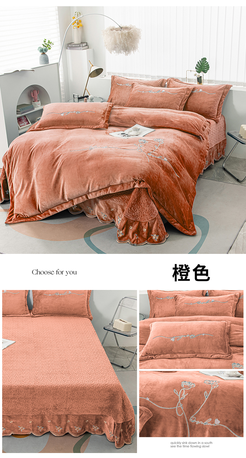 商品名称:乐嘉盈 2025新款牛奶绒刺绣床盖款四件套-心怡玫瑰 心怡玫瑰-橙色