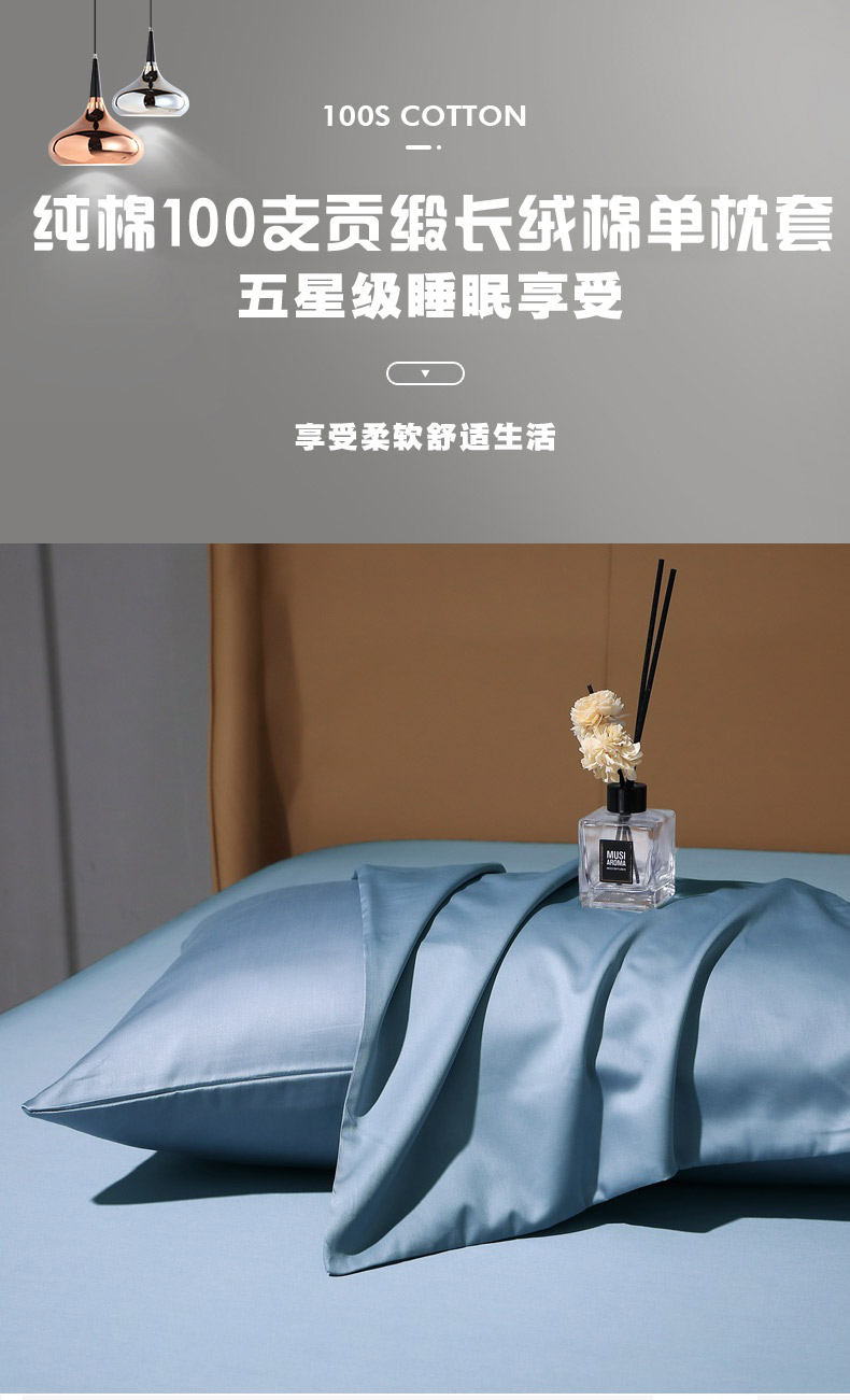 晶缦家纺 2024新款100S全棉贡缎长绒棉纯色四件套和单品-纯沐系列 单枕套 纯沐-天青蓝