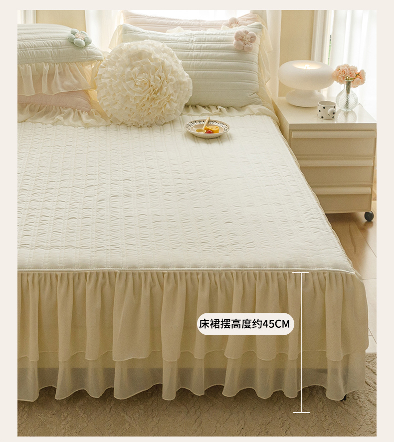 商品名称:胜权家纺 2024新款A类水洗60支全棉工艺款夹棉床裙三件套 花儿朵朵-云柔白