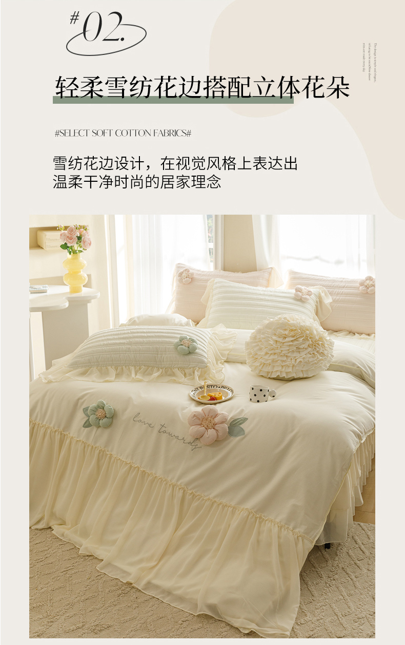 胜权家纺 2024新款A类水洗60支全棉工艺款夹棉床裙四件套 花儿朵朵-云柔白