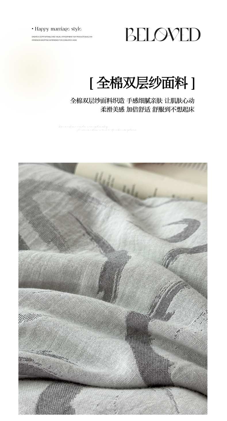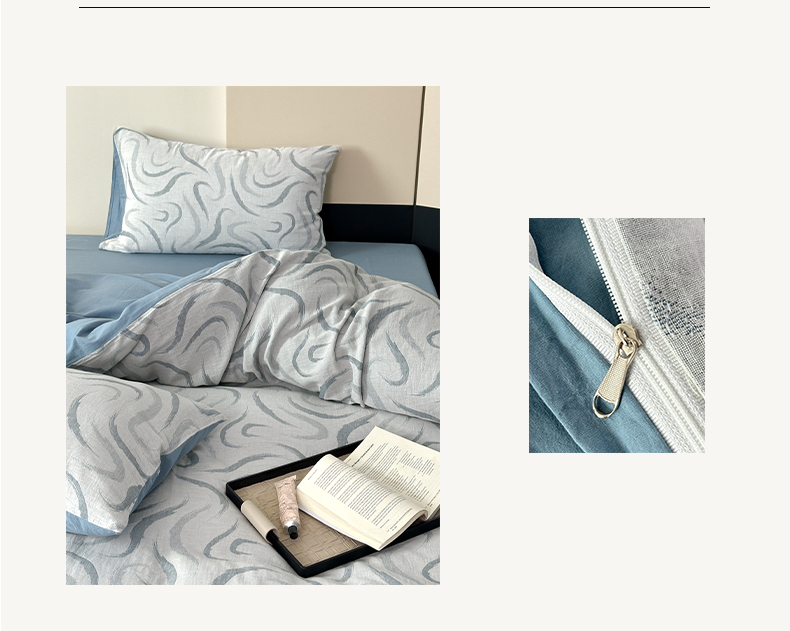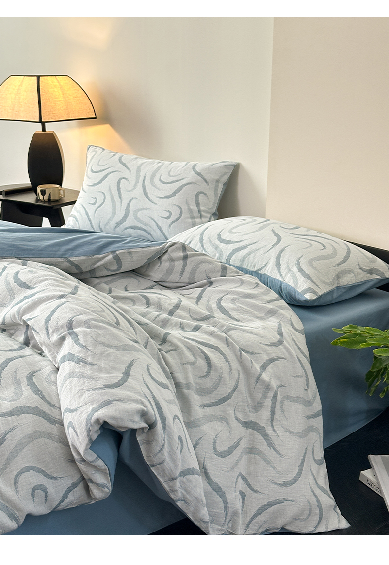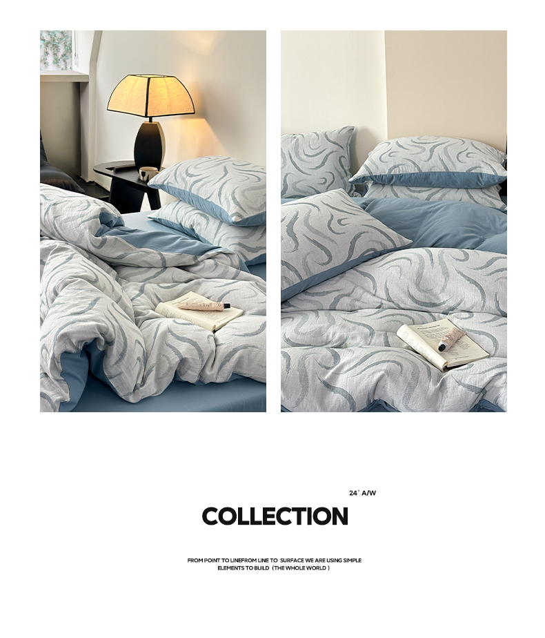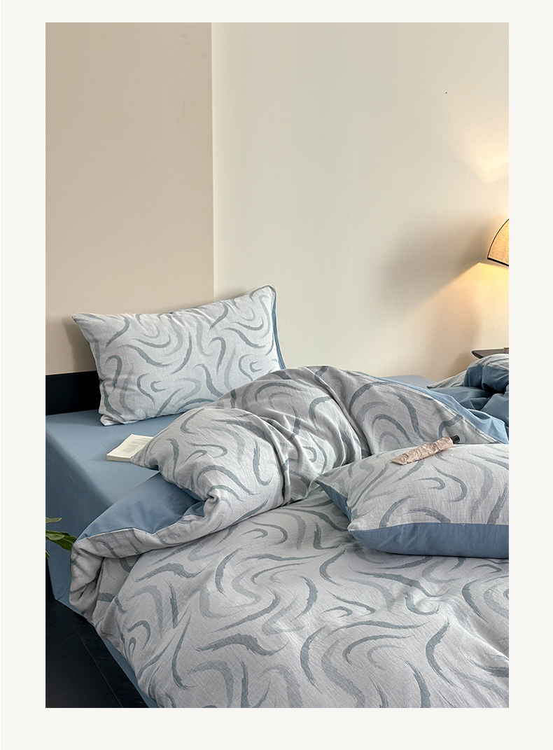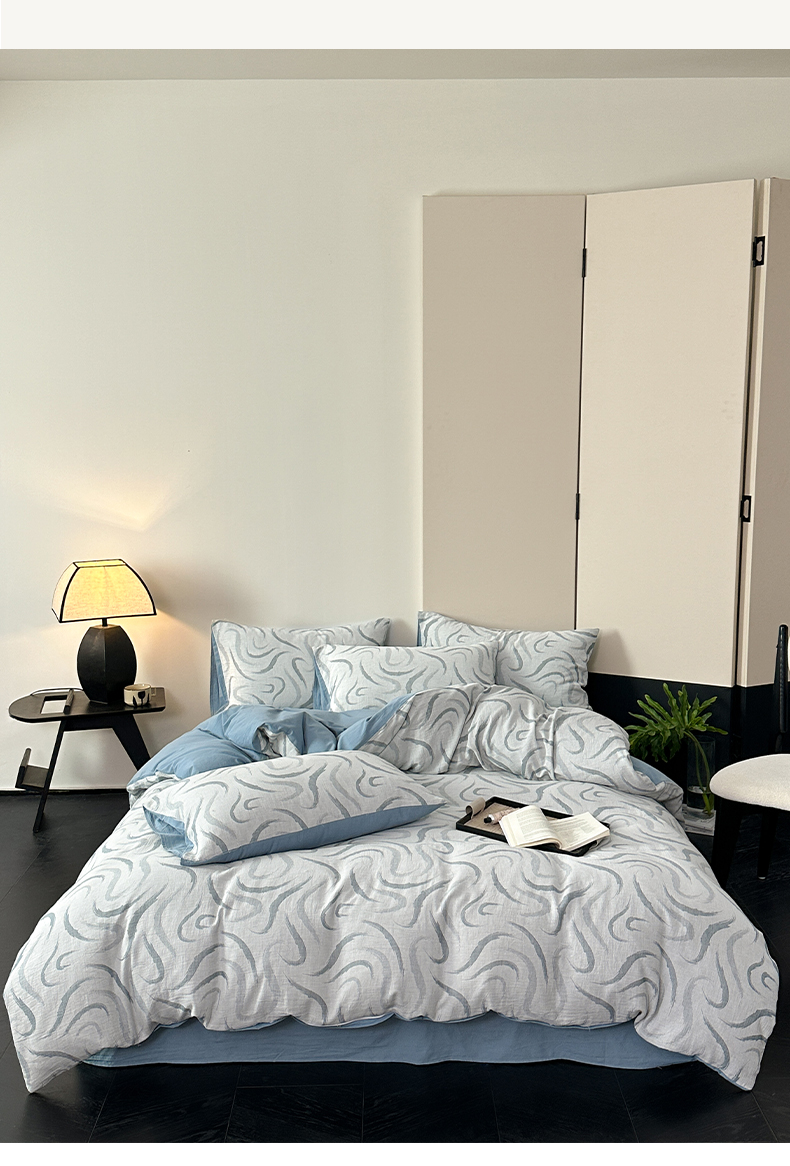 雅居纺家纺 2024新款全棉双层纱色织提花四件套 潮流-蓝