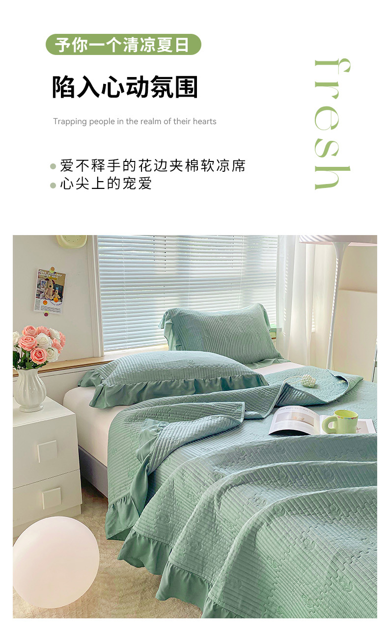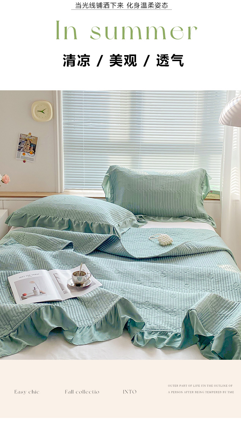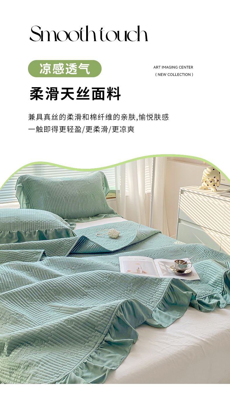 商品名称:胜权家纺 2024新款A类60S天丝夹棉绣花床盖三件套 静待花开--浅豆绿