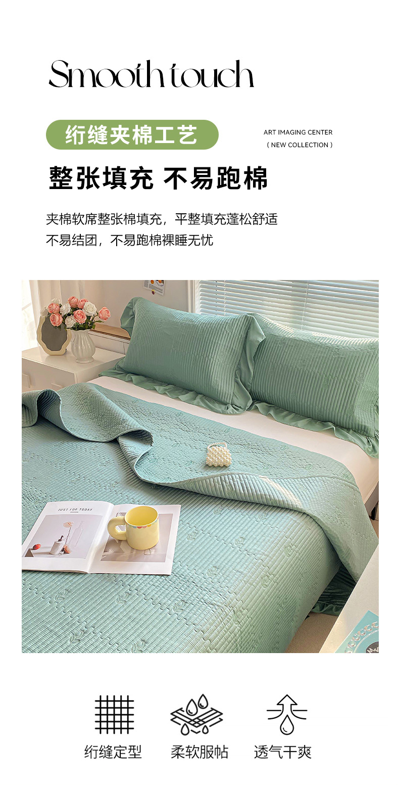 胜权家纺 2024新款A类60S天丝夹棉绣花床盖三件套 静待花开--浅豆绿