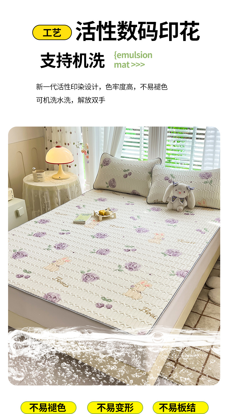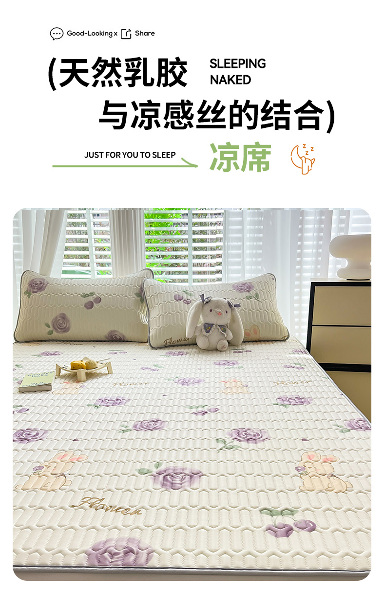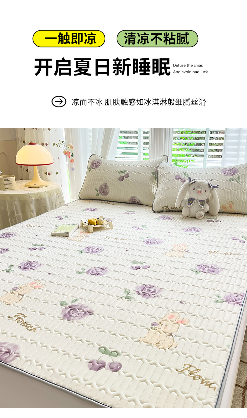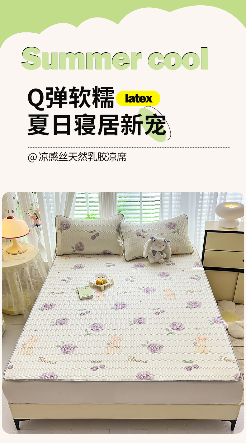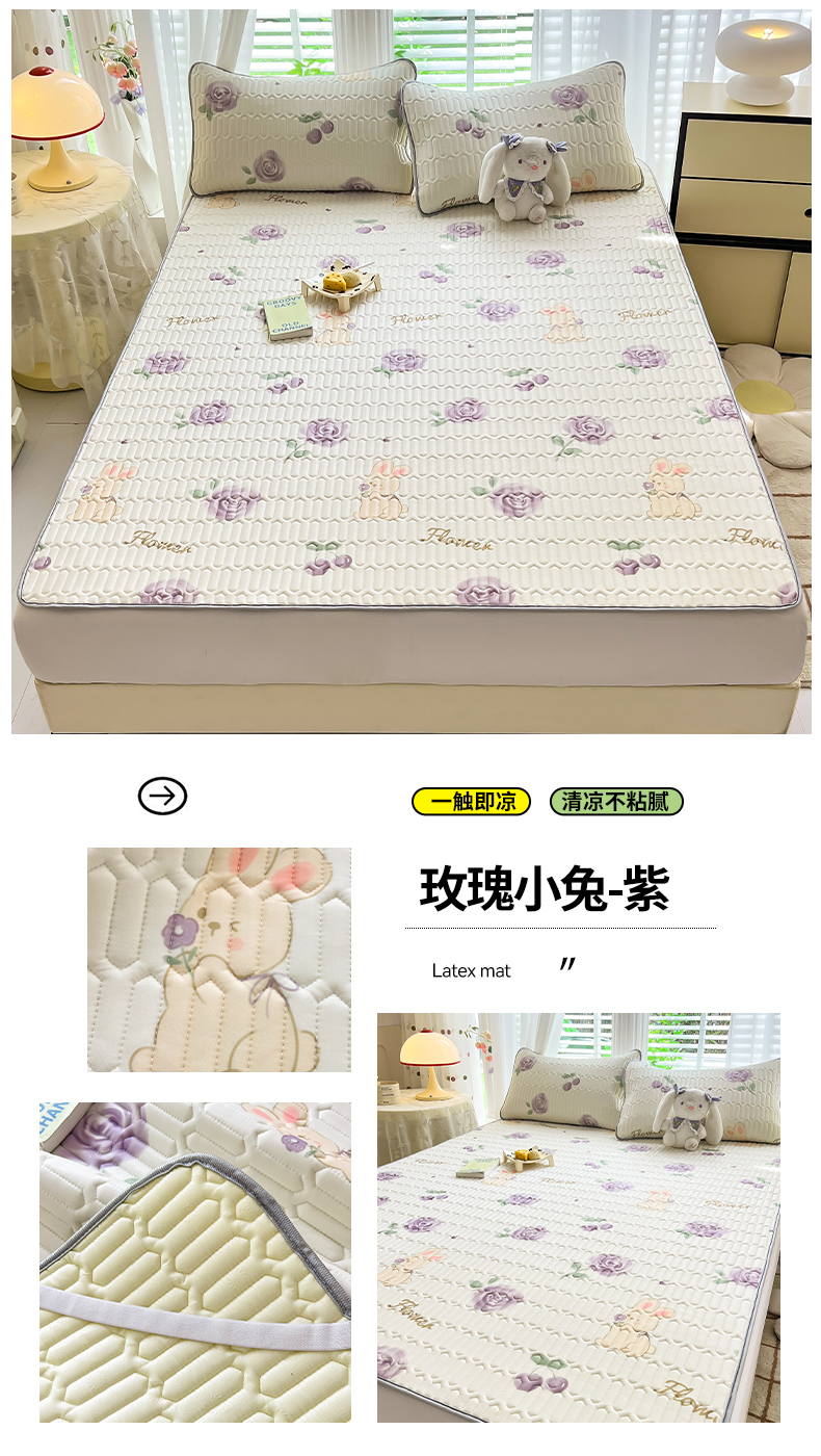 商品名称:佳梦达 2025新款0.4厚度印花凉感丝乳胶凉席 玫瑰小兔-紫