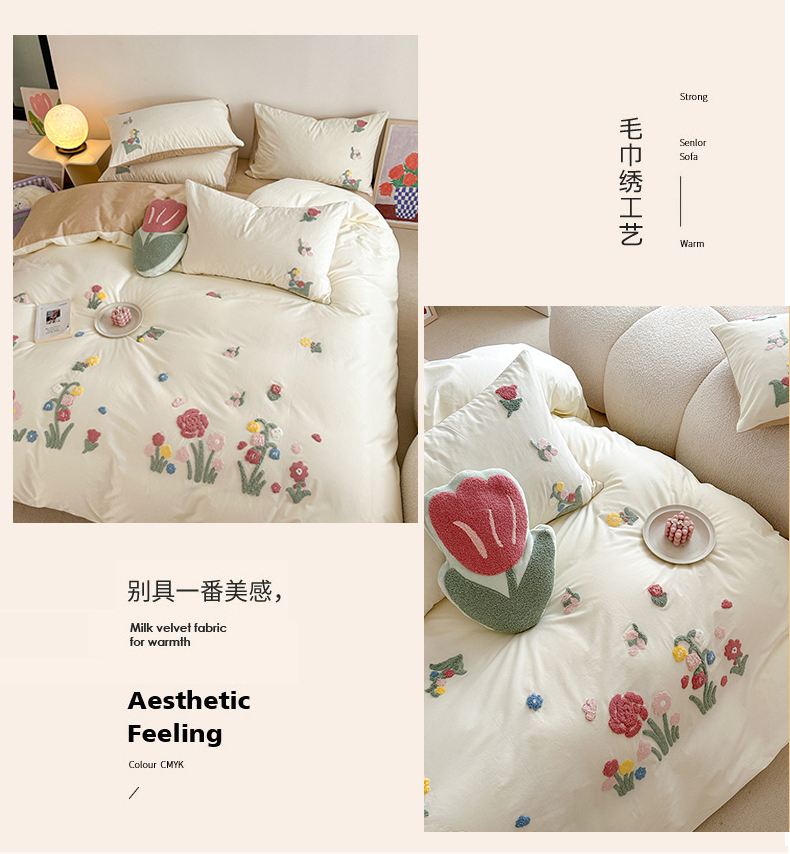 (总)眠屿家纺 2025新款加厚牛奶绒毛巾绣四件套,乐趣,面包狗,玩偶,玩泡泡