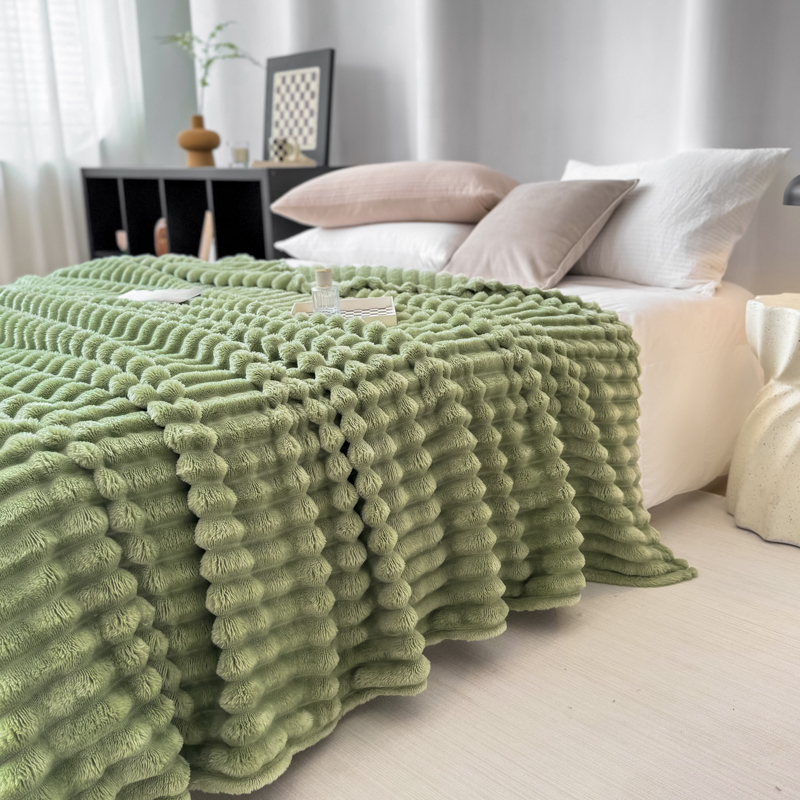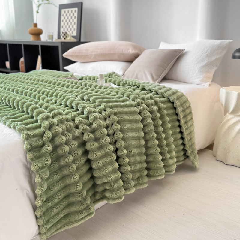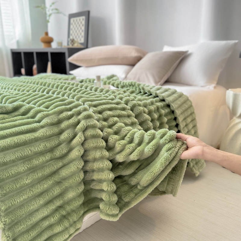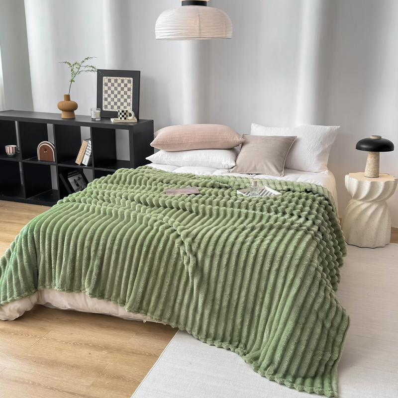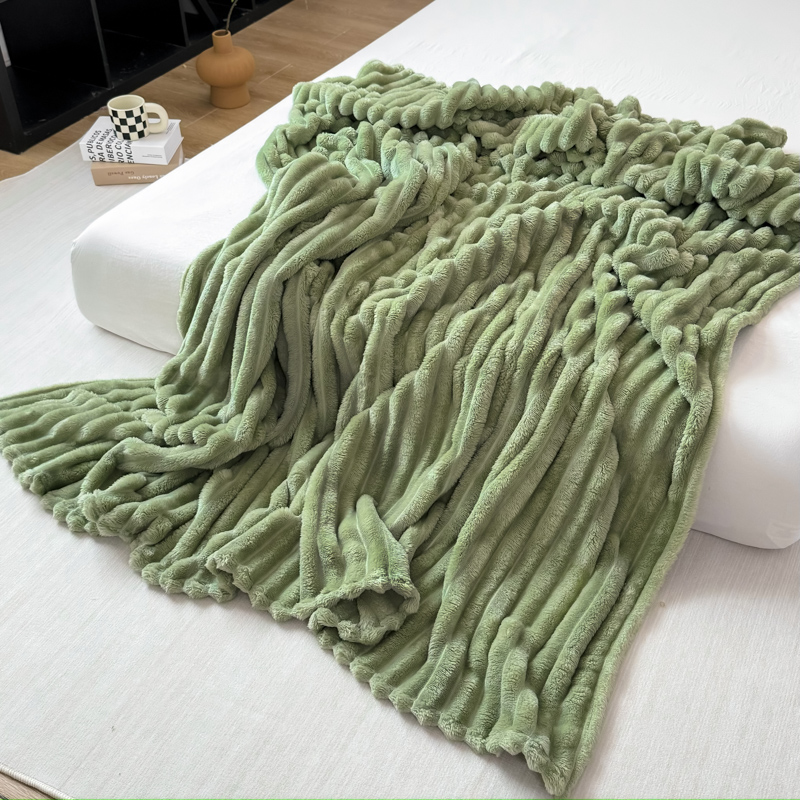 羋多 2024新款跨境仿兔毛绒多功能毛毯高克重魔法绒4公分宽抽条毛毯 远山绿