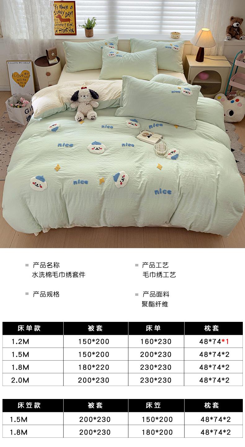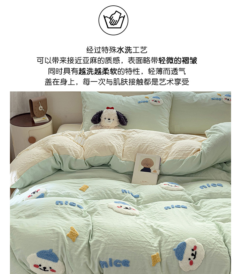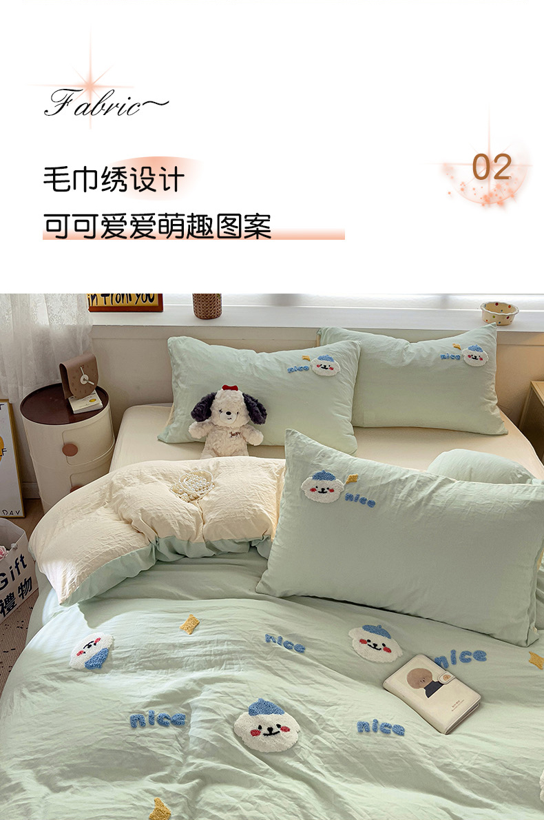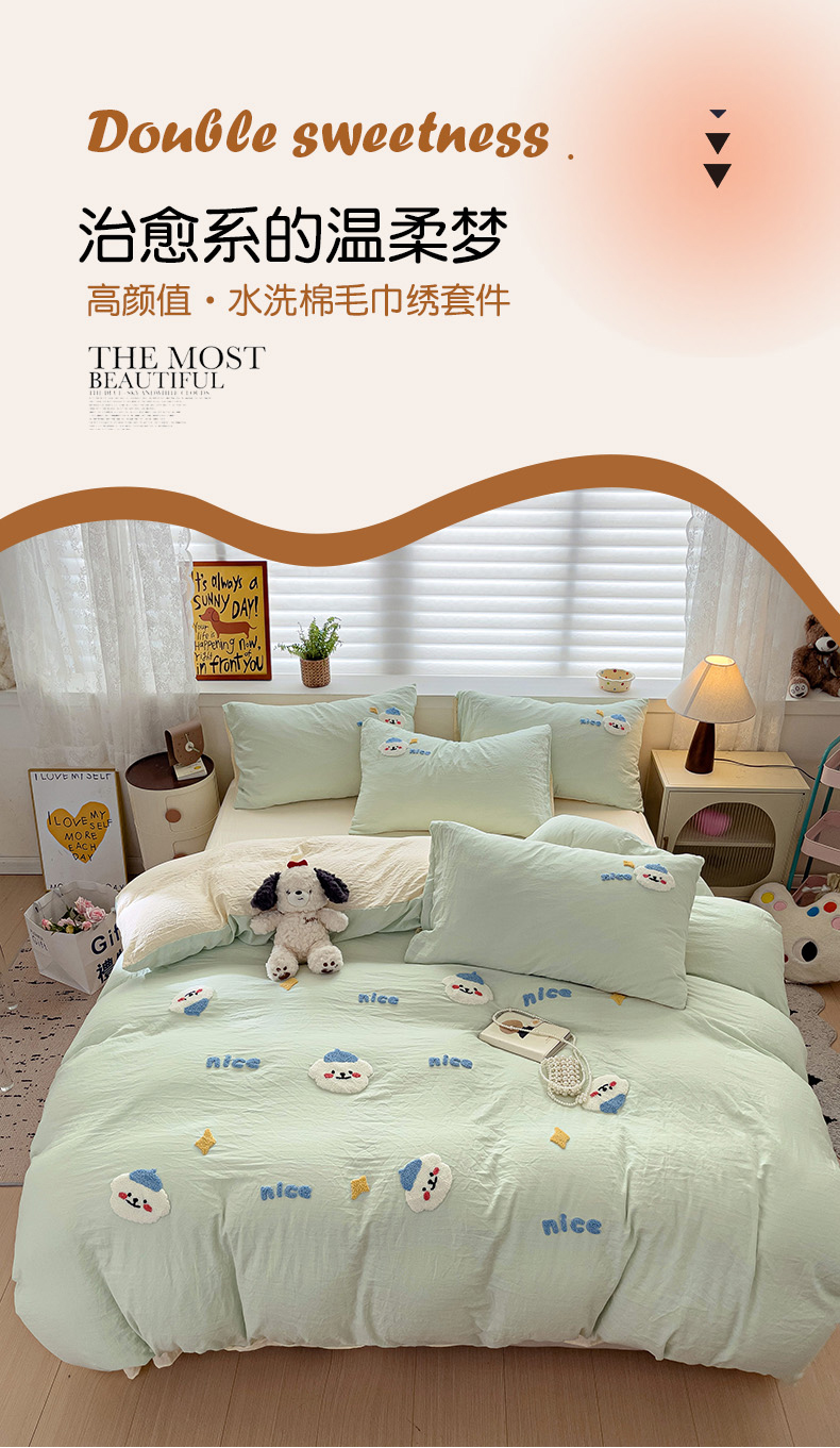 当前位置: 91家纺网 > 商品网购 > 床品套件 > 四件套 > 毛巾绣四件套 > 韩巢家纺 2024爆款四季通用超柔水洗棉毛巾绣四件套-哈哈狗系列(提供精美卖家秀) 哈哈狗浅绿黄