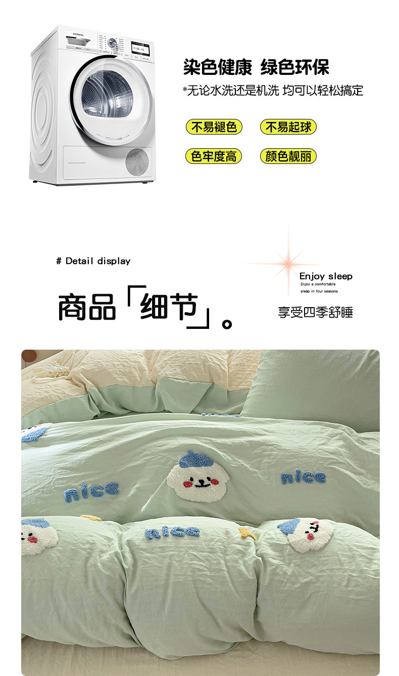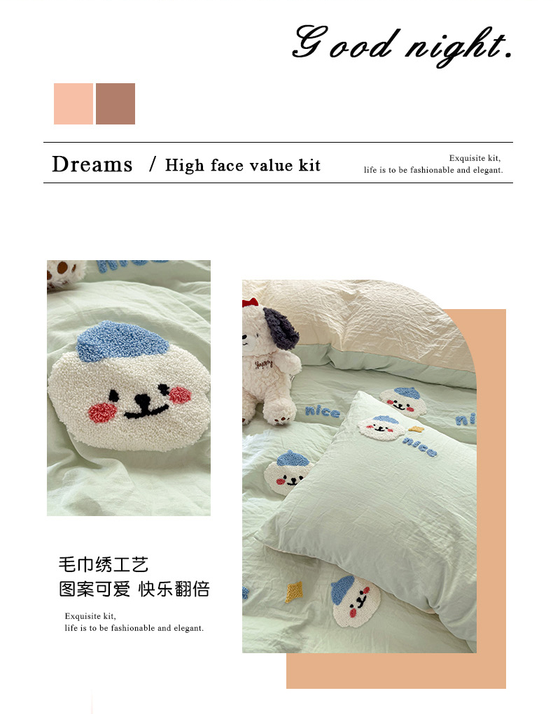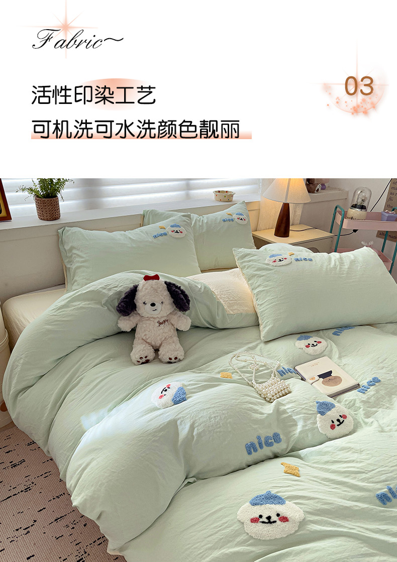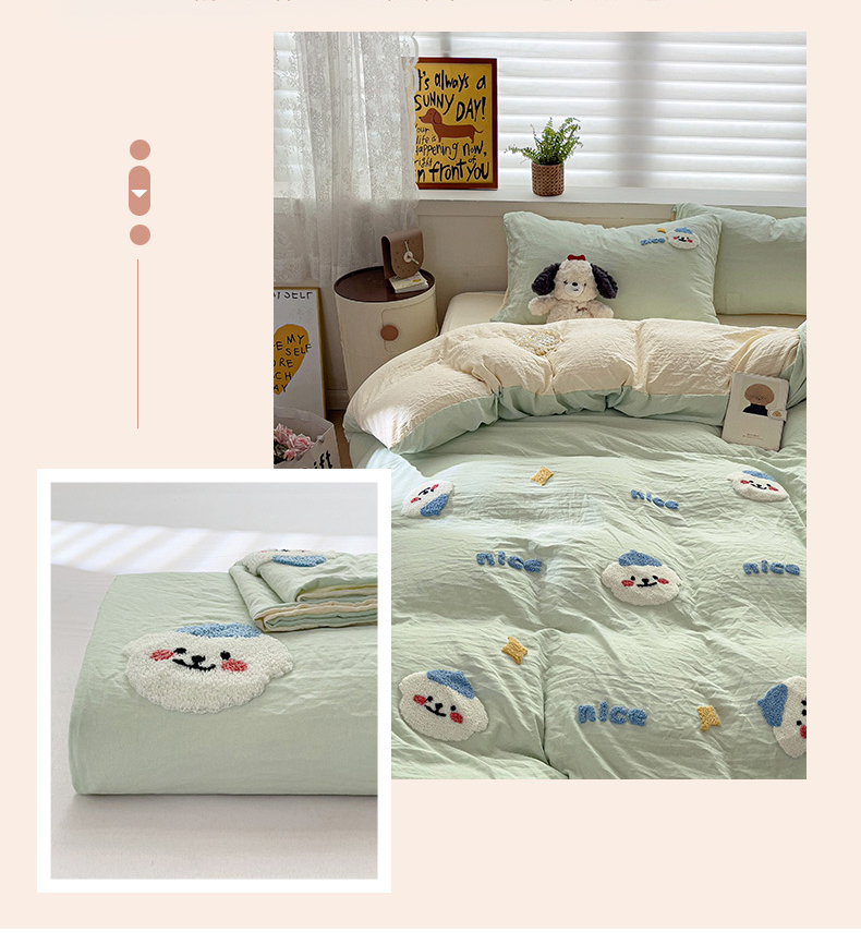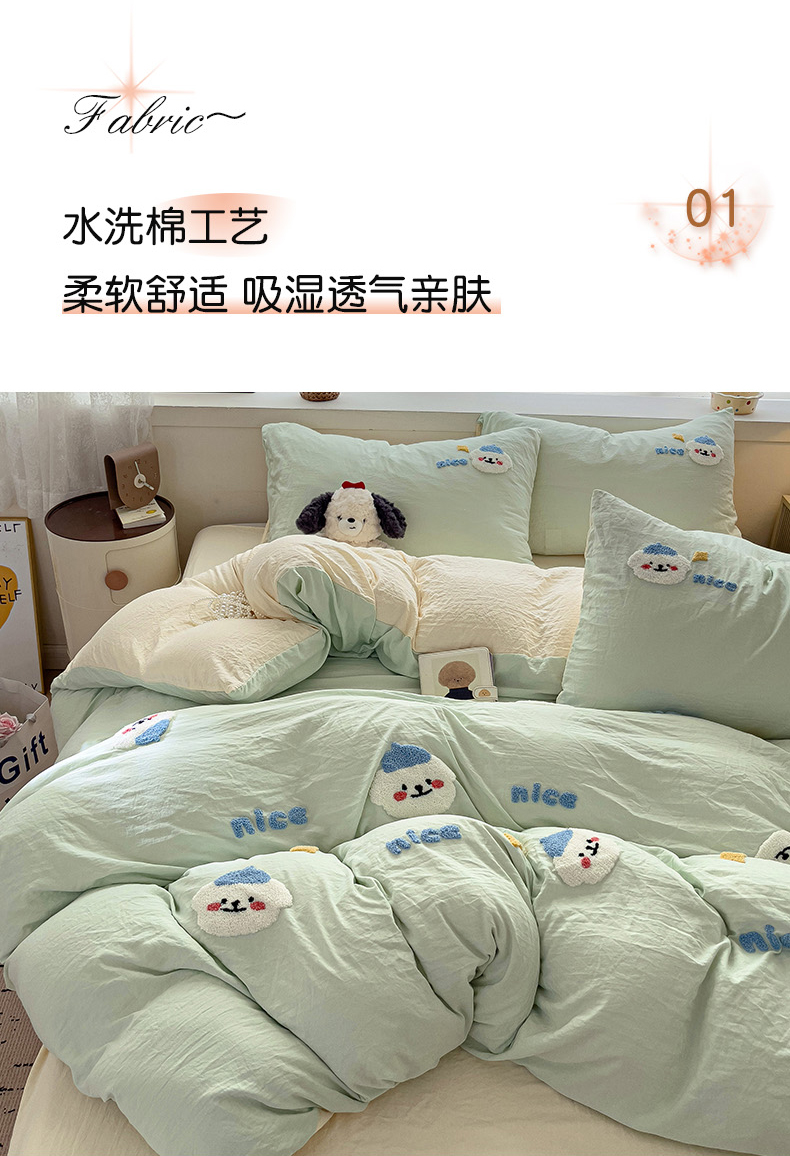 当前位置: 91家纺网 > 商品网购 > 床品套件 > 四件套 > 毛巾绣四件套 > 韩巢家纺 2024爆款四季通用超柔水洗棉毛巾绣四件套-哈哈狗系列(提供精美卖家秀) 哈哈狗浅绿黄