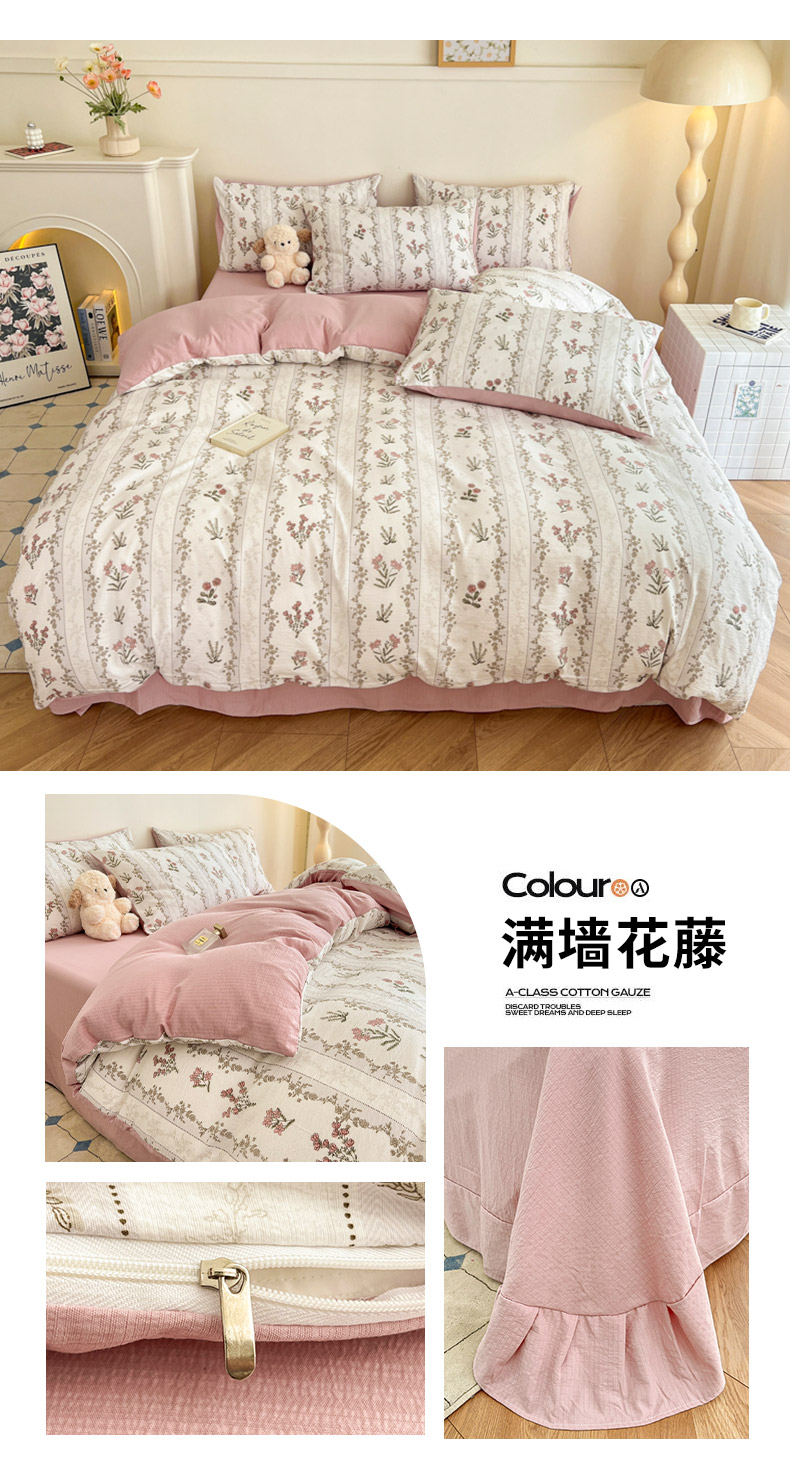 (总)金梦拉家纺 2025新款提花纱布棉双层纱皱皱纱四件套,微醺玫瑰,梦华录,花开半夏,漫山紫野,薄荷初夏,点点草莓,法式浪漫,粉杏绿,花颜,惠心,桔梗紫,咖调蝴蝶结,快乐狗,梨落,林间兔,绿意,绿茵,满园春色,曼塔庄园,萌萌小兔,雾野山茶,小野菊,寻春,樱桃,月梨漫香,芝士黄,枝蔓绿,紫线调,紫樱落