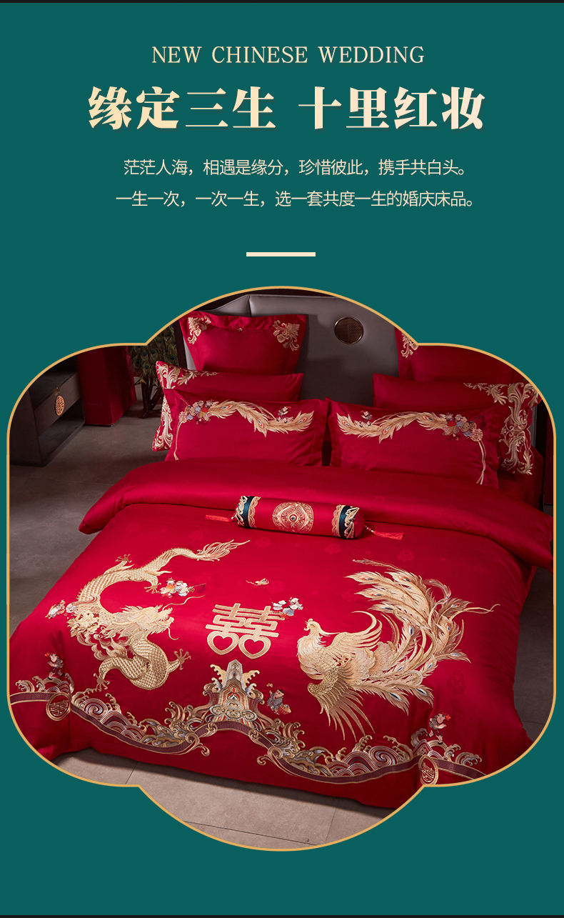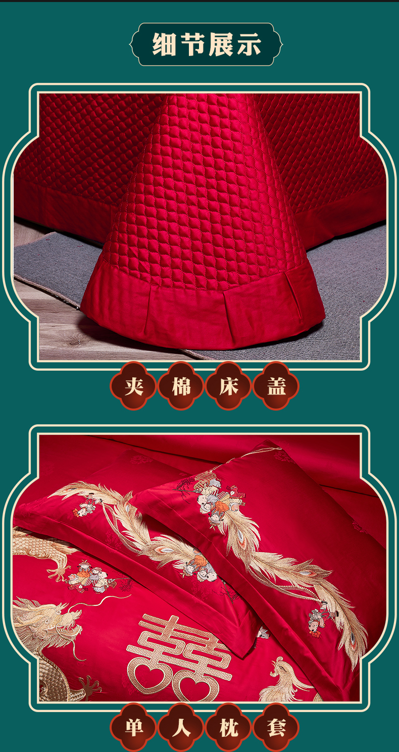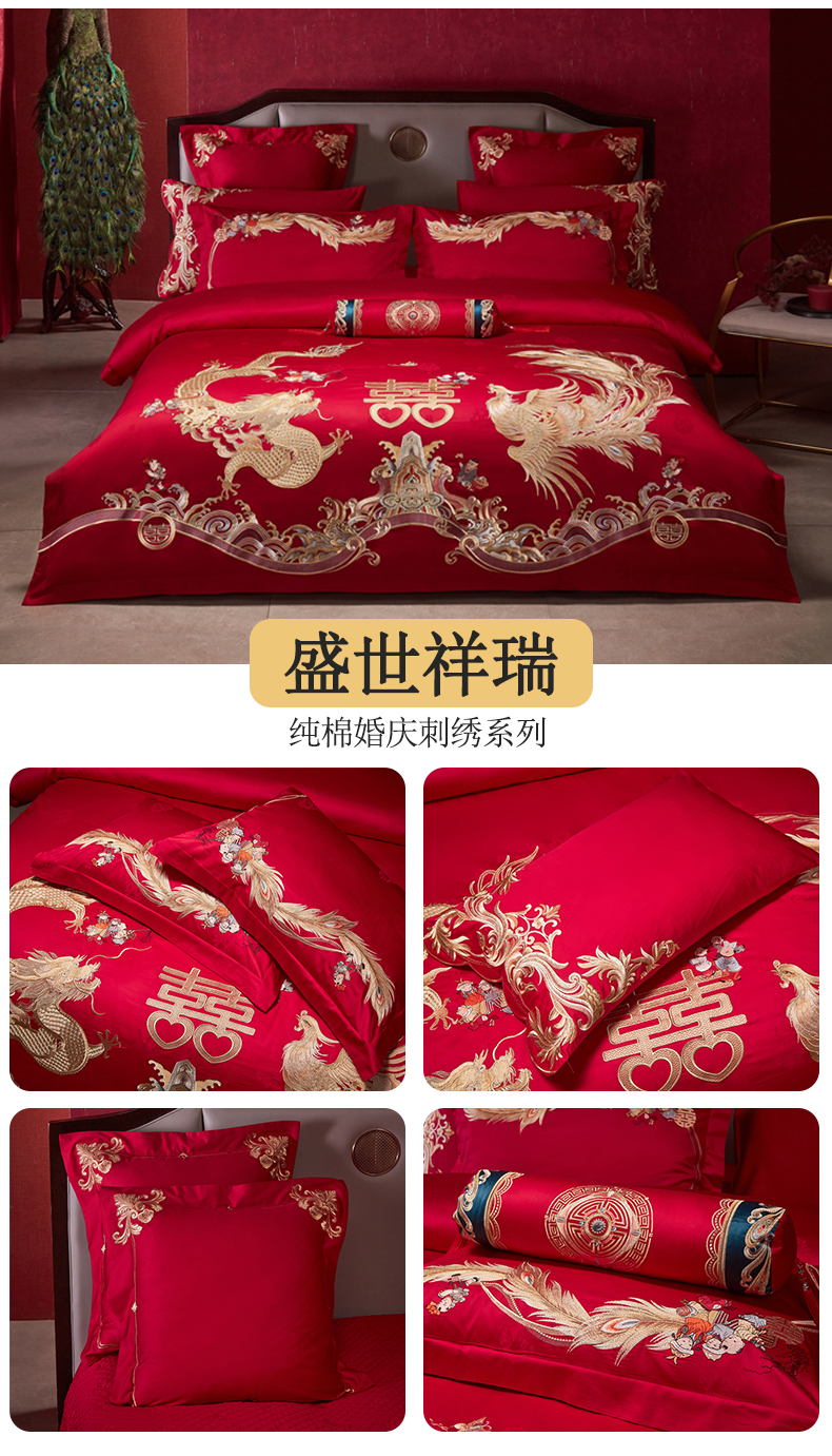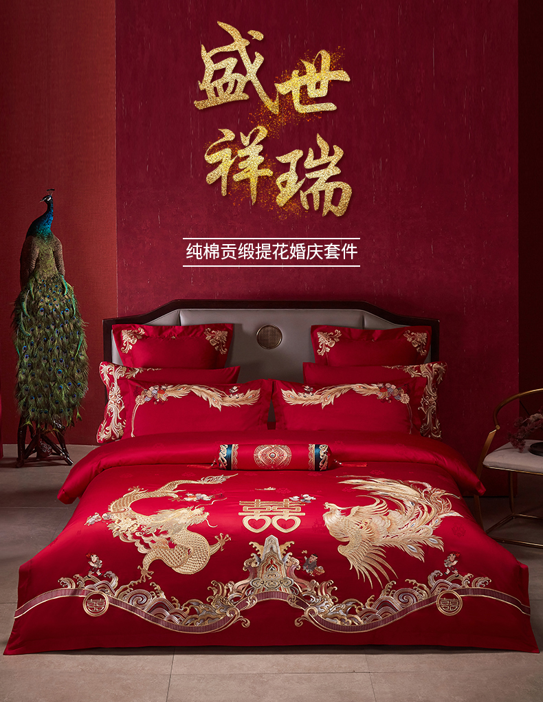 当前位置: 91家纺网 > 商品网购 > 床品套件 > 四件套 > 婚庆四件套 > 宏羽纺家纺 2024新款高支高密纯棉提花婚庆套件系列(控价680)盛世祥瑞