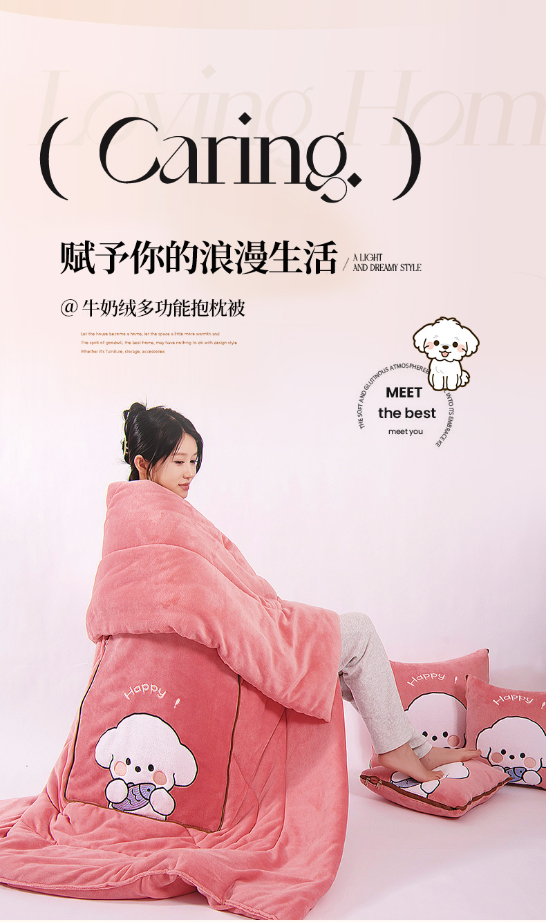 阳光依佰抱枕被 2024秋冬新款牛奶绒可萌狗多功能抱枕被 可萌狗-西瓜红