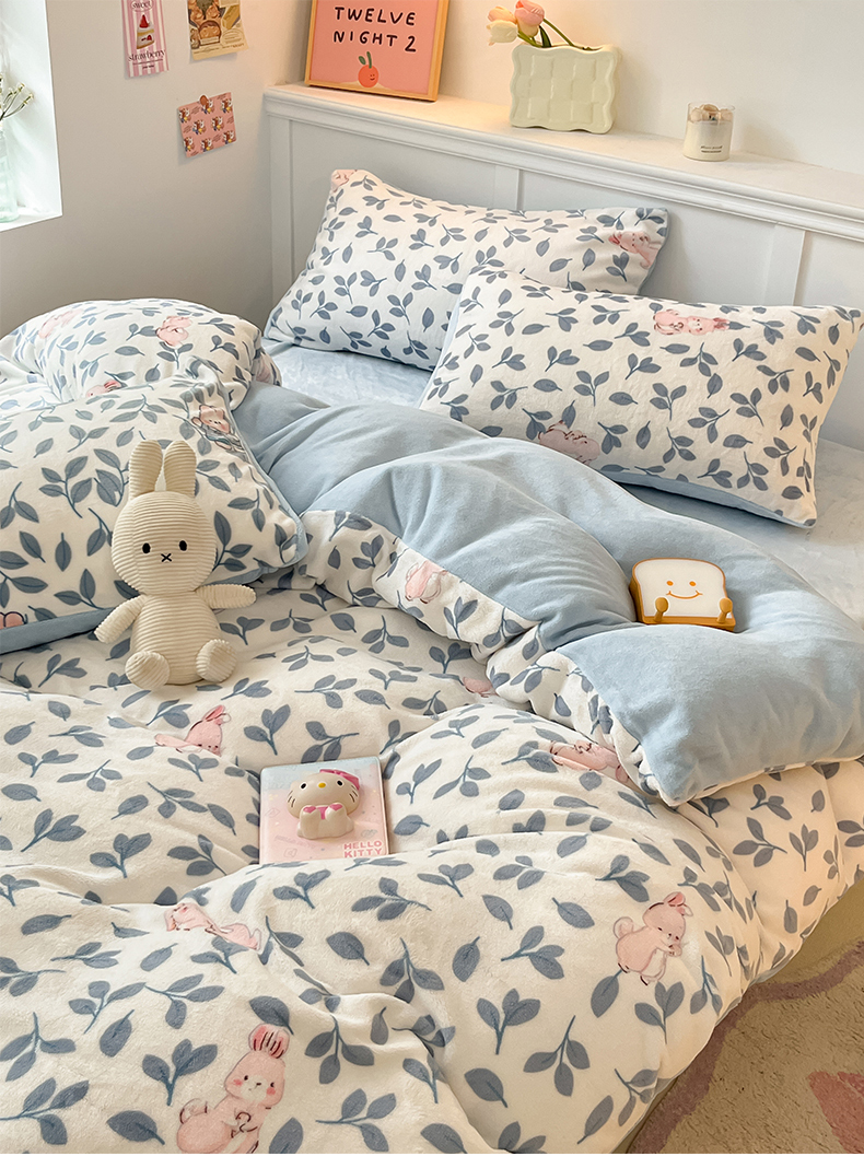 桃子家居 2024新款小清新卡通加厚牛奶绒全工艺200克印花牛奶绒系列四件套 绒-萌萌兔