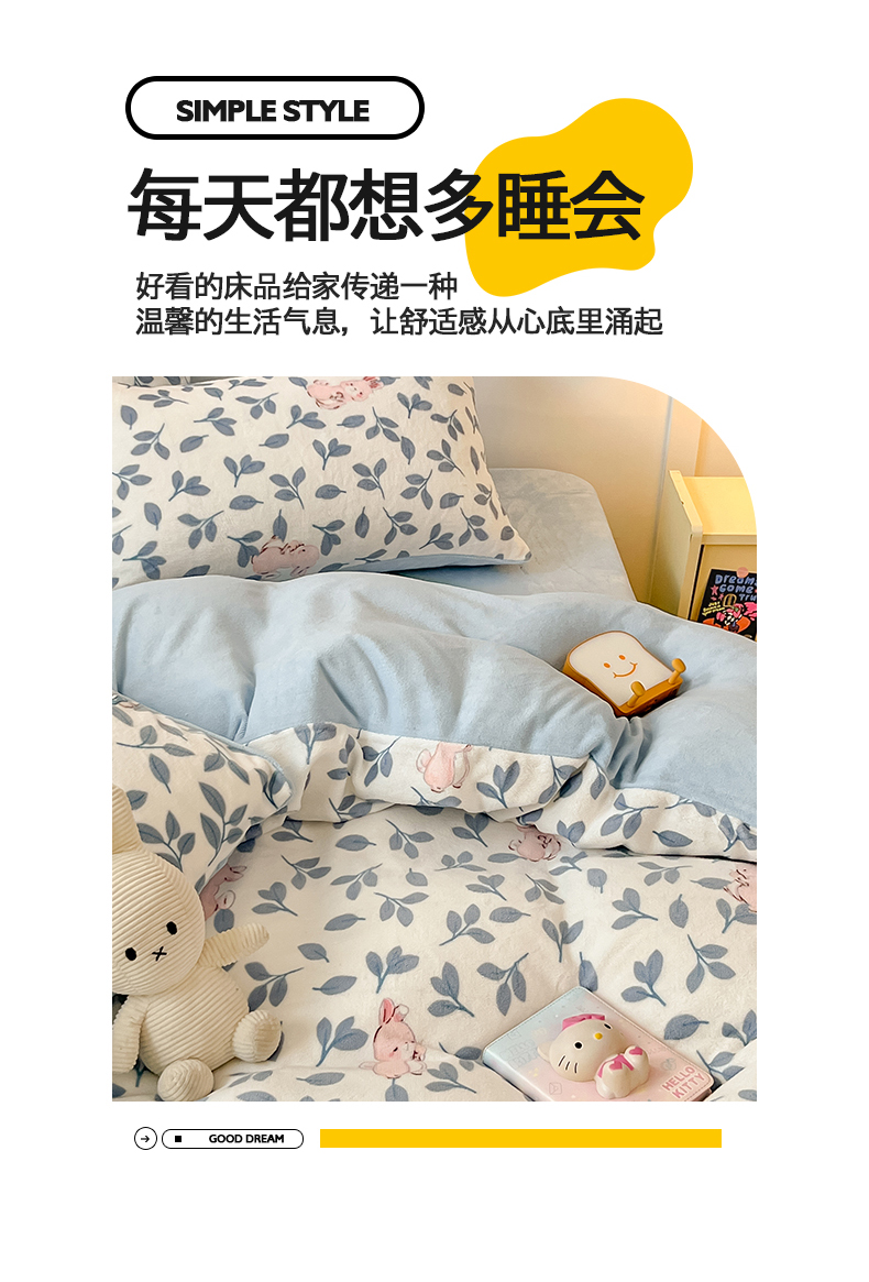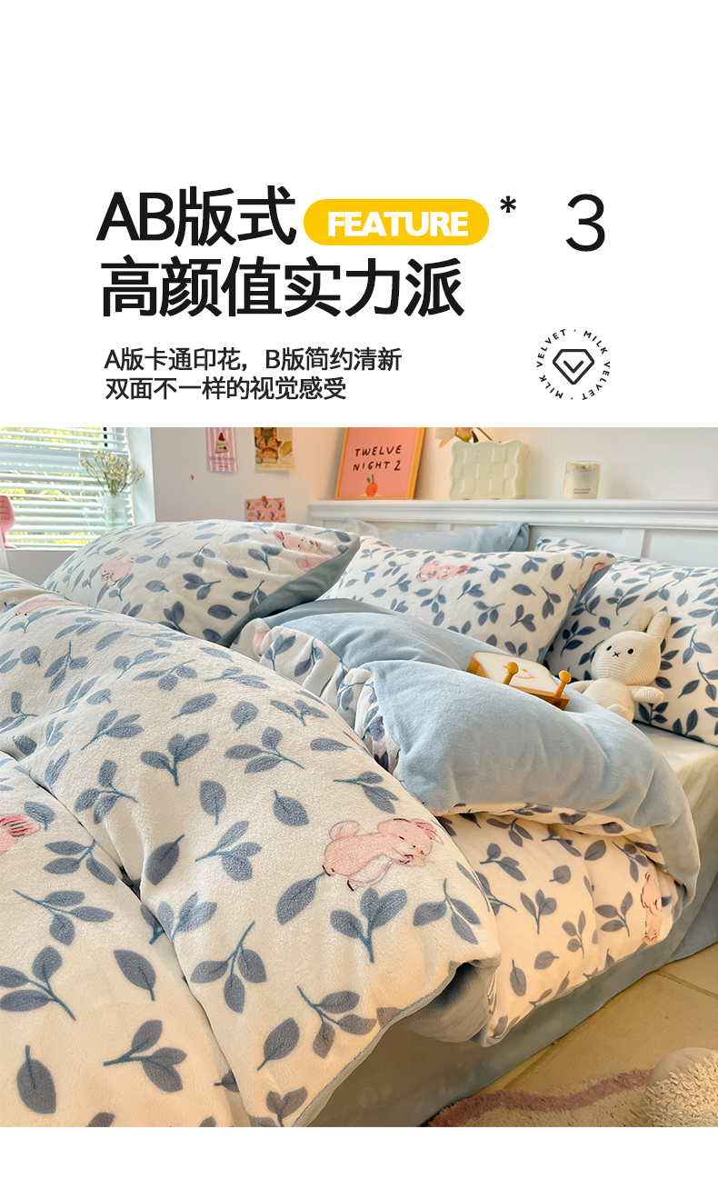 商品名称:桃子家居 2024新款小清新卡通加厚牛奶绒全工艺200克印花牛奶绒系列四件套 绒-萌萌兔