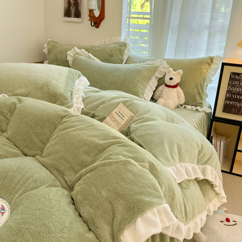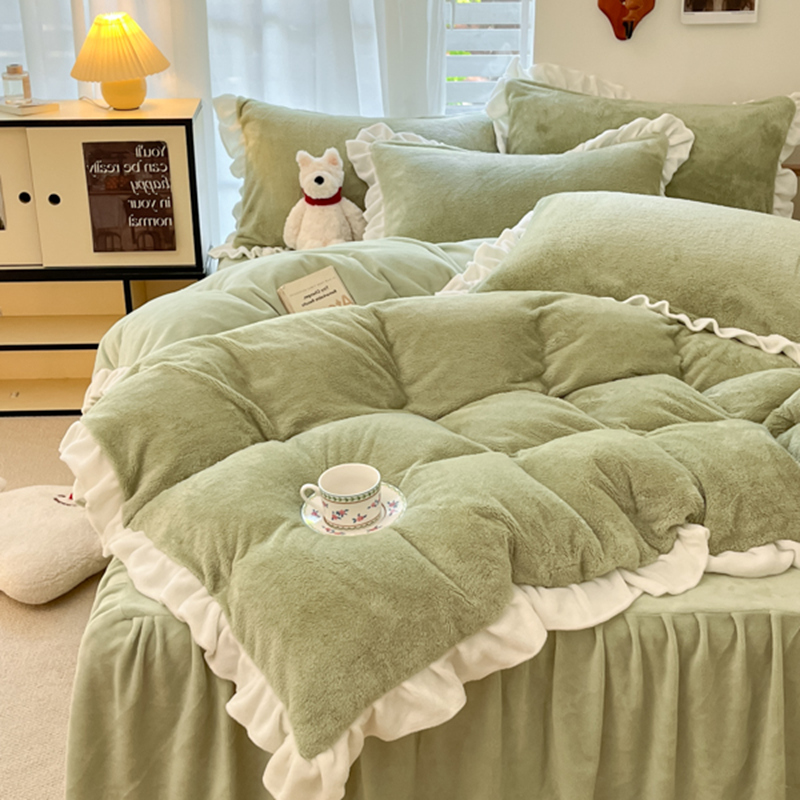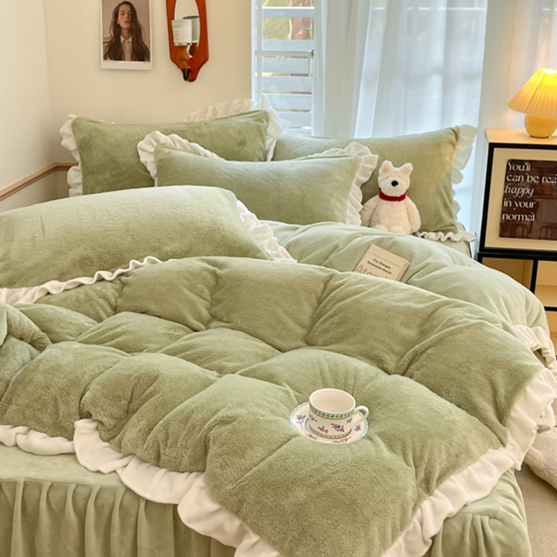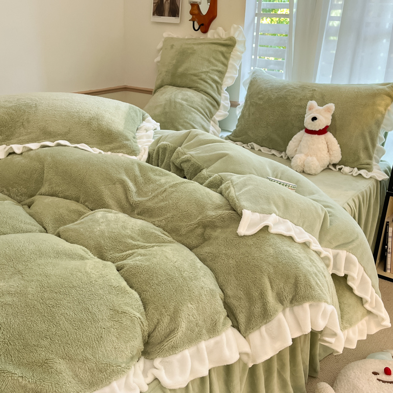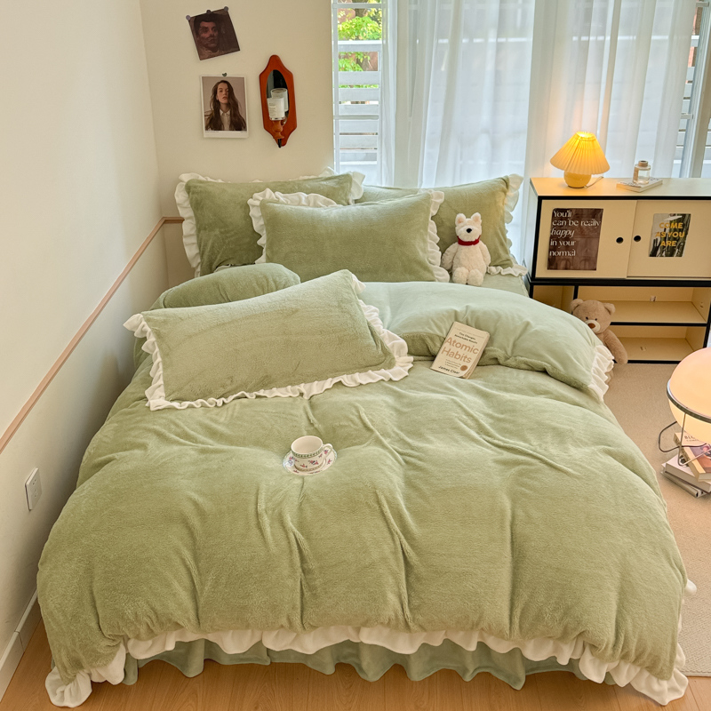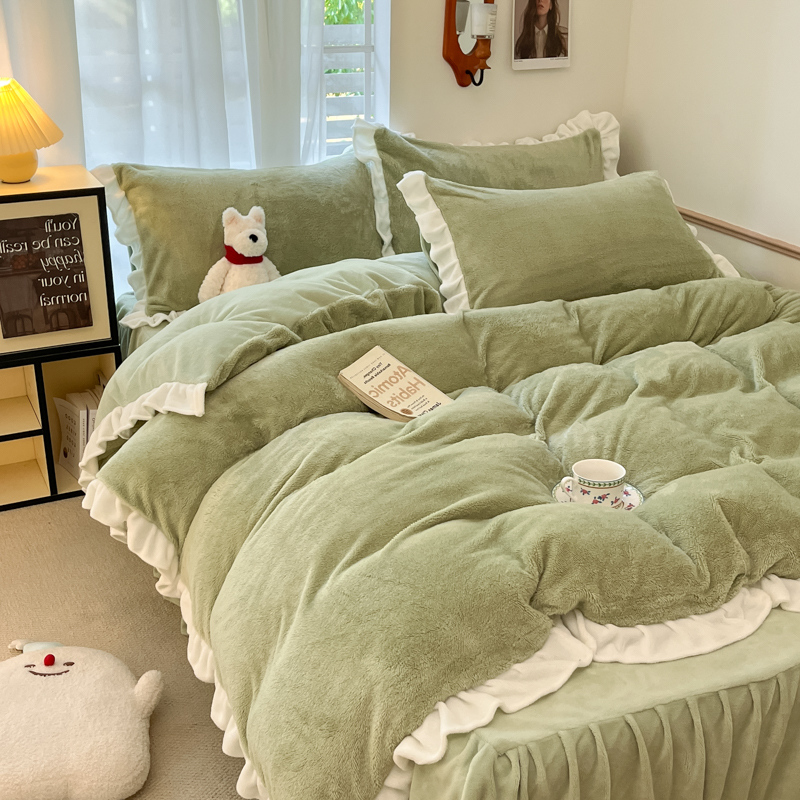 星座家纺 2025新款牛奶绒花边床裙款四件套 床裙款-淡雅绿