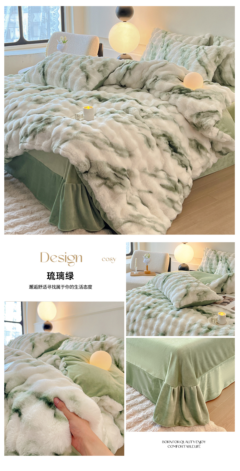 当前位置: 91家纺网 > 商品网购 > 床品套件 > 四件套 > 兔毛绒四件套 > 铠畅家纺 2024新款兔毛绒牛奶绒四件套 琉璃绿