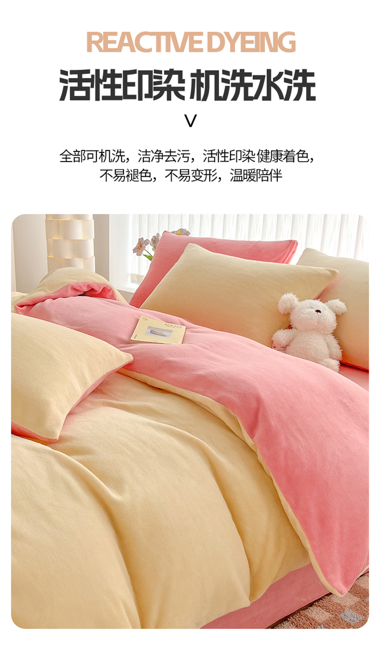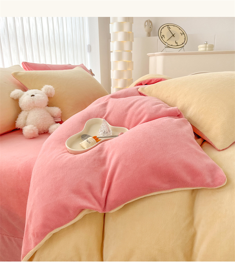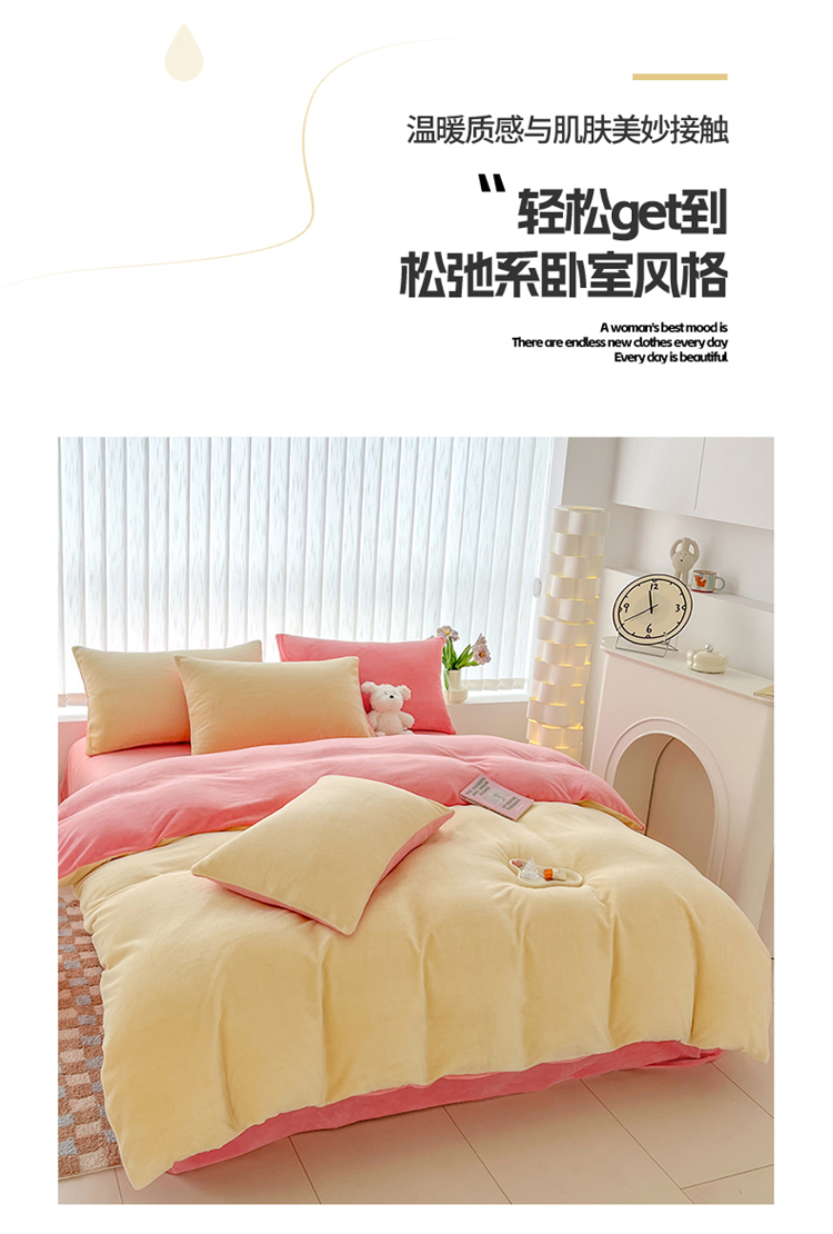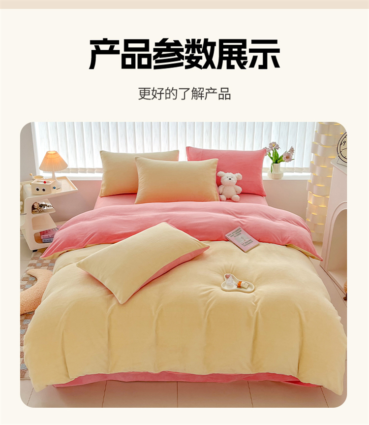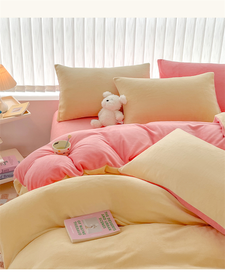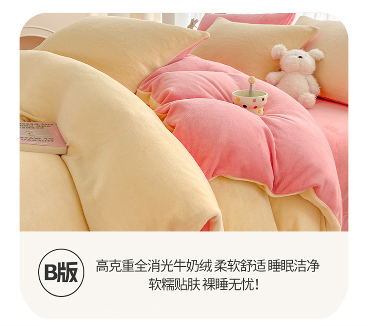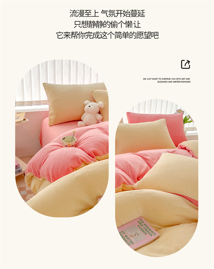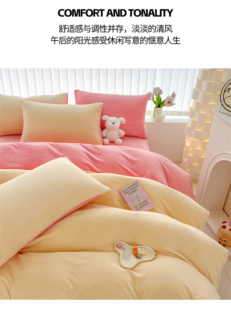 商品名称:言熙居 2024新款纯色双拼30克8一9斤牛奶绒四件套 奶黄拼浅粉