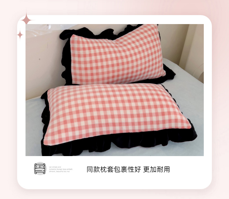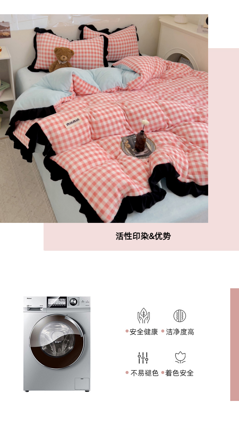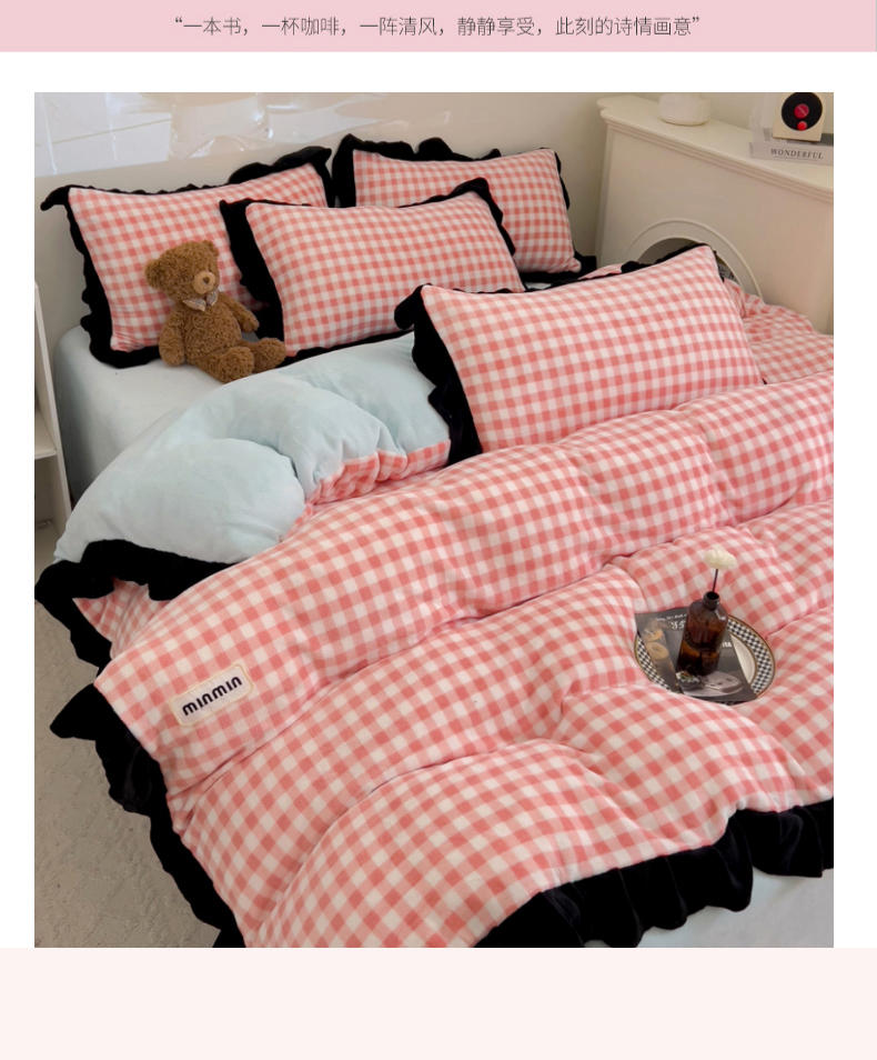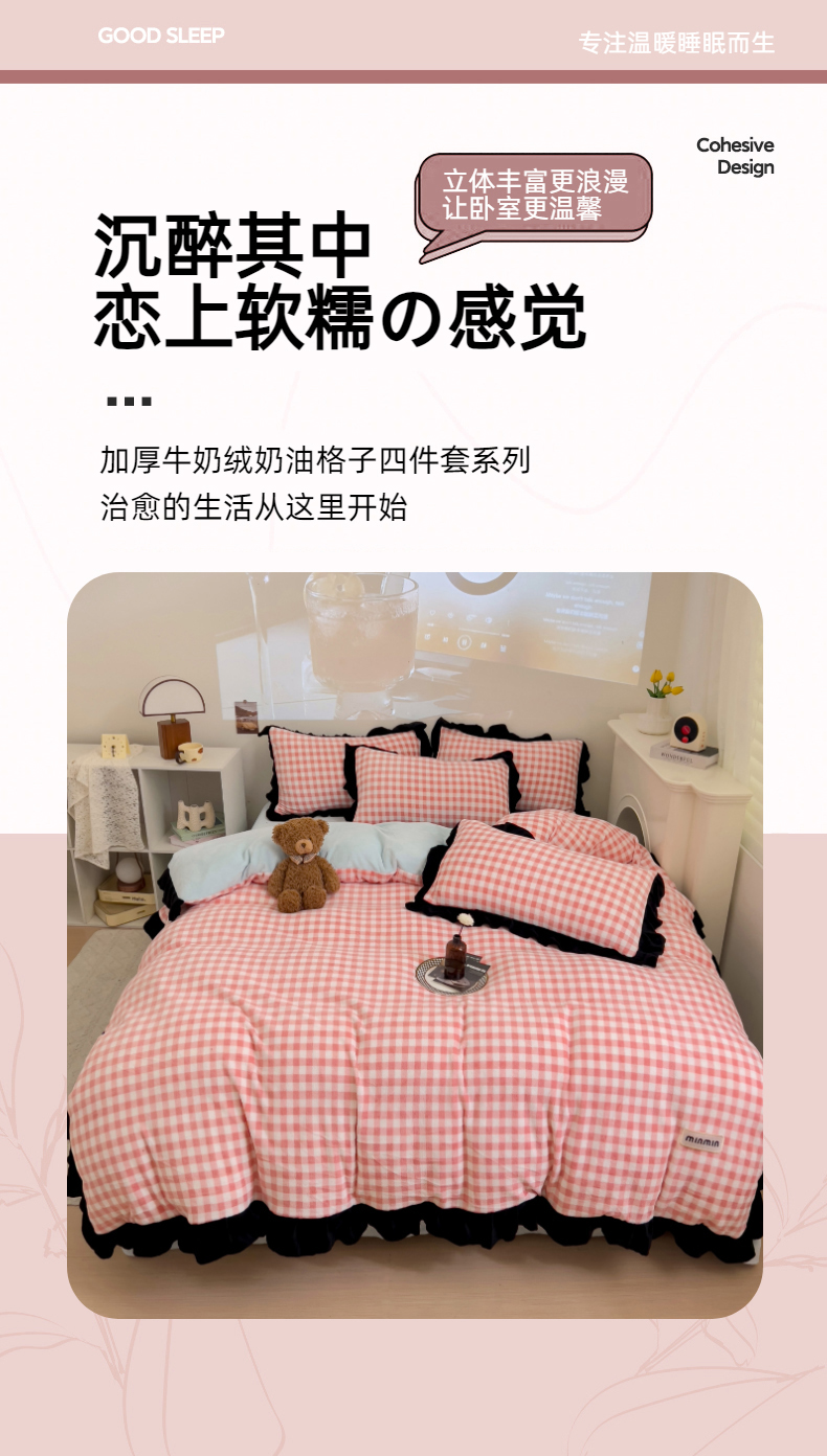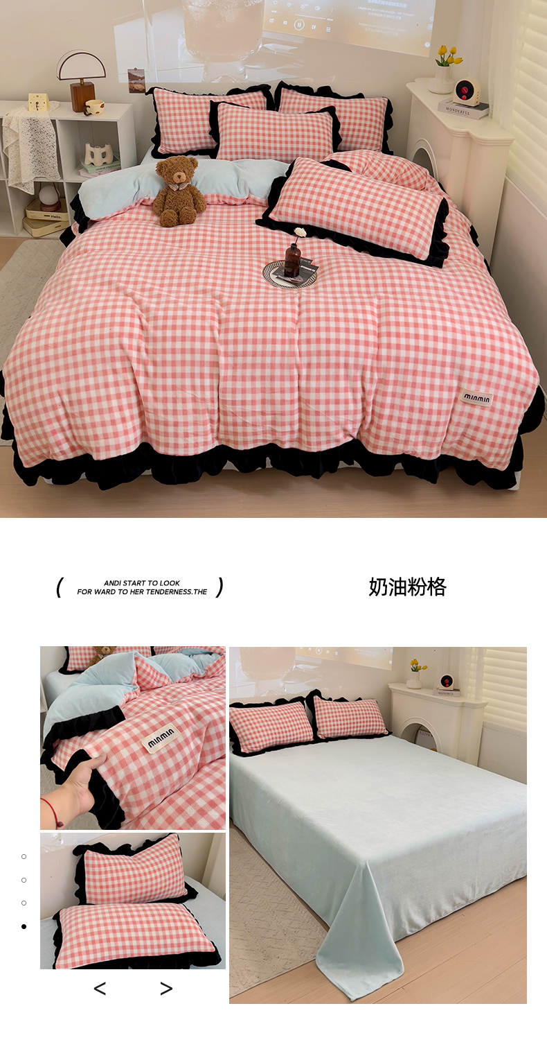 商品名称:米莱家纺 2024新款韩式花边牛奶绒四件套 奶油粉格