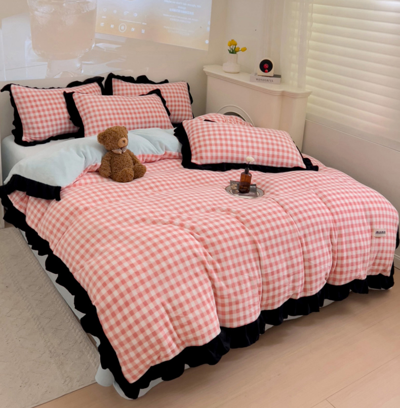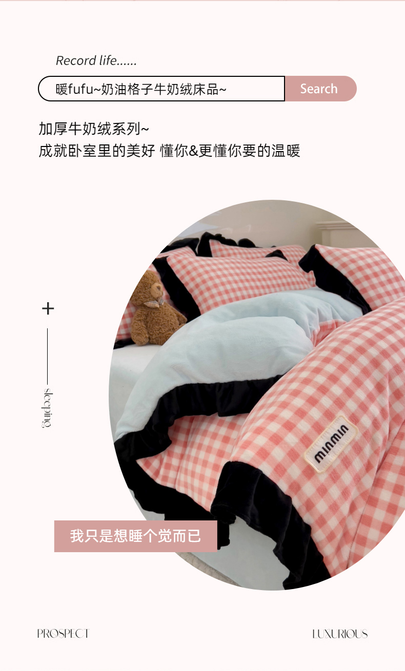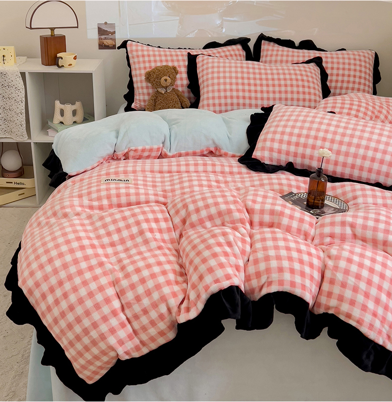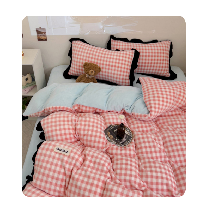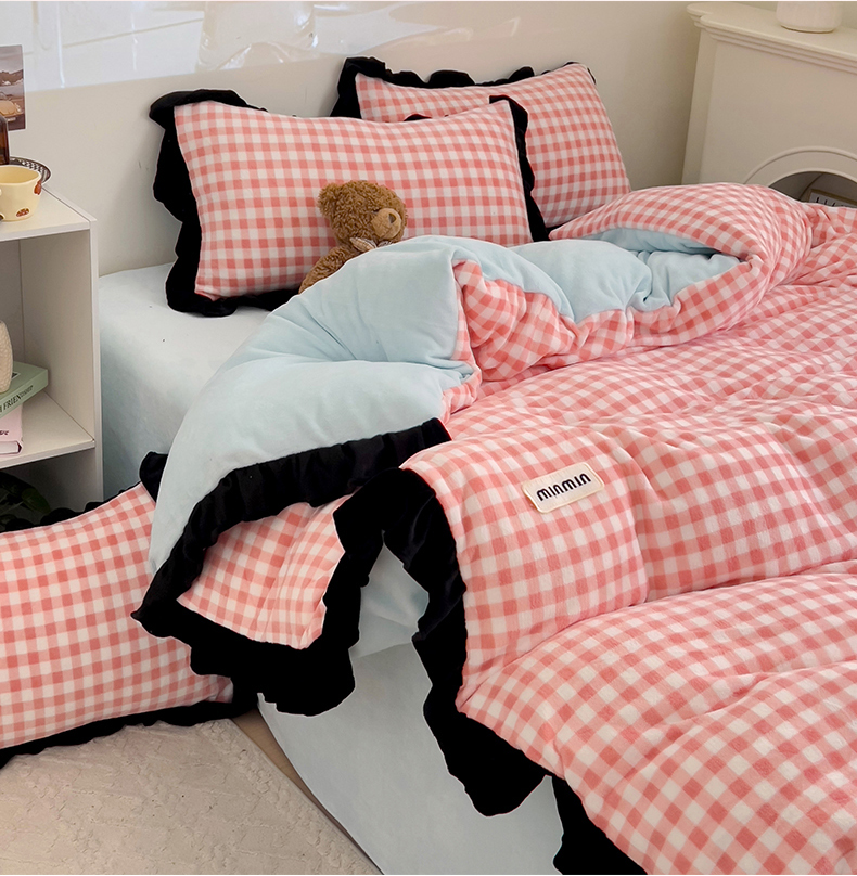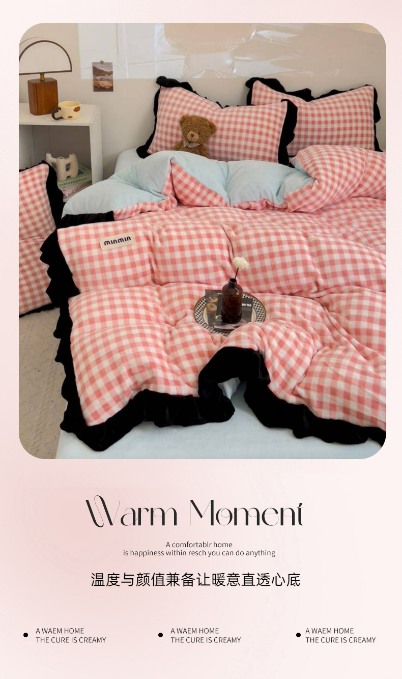 商品名称:米莱家纺 2024新款韩式花边牛奶绒四件套 奶油粉格