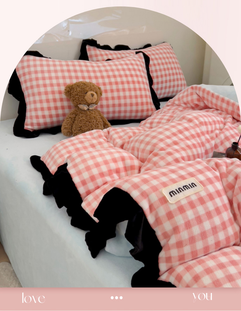 米莱家纺 2024新款韩式花边牛奶绒四件套 奶油粉格