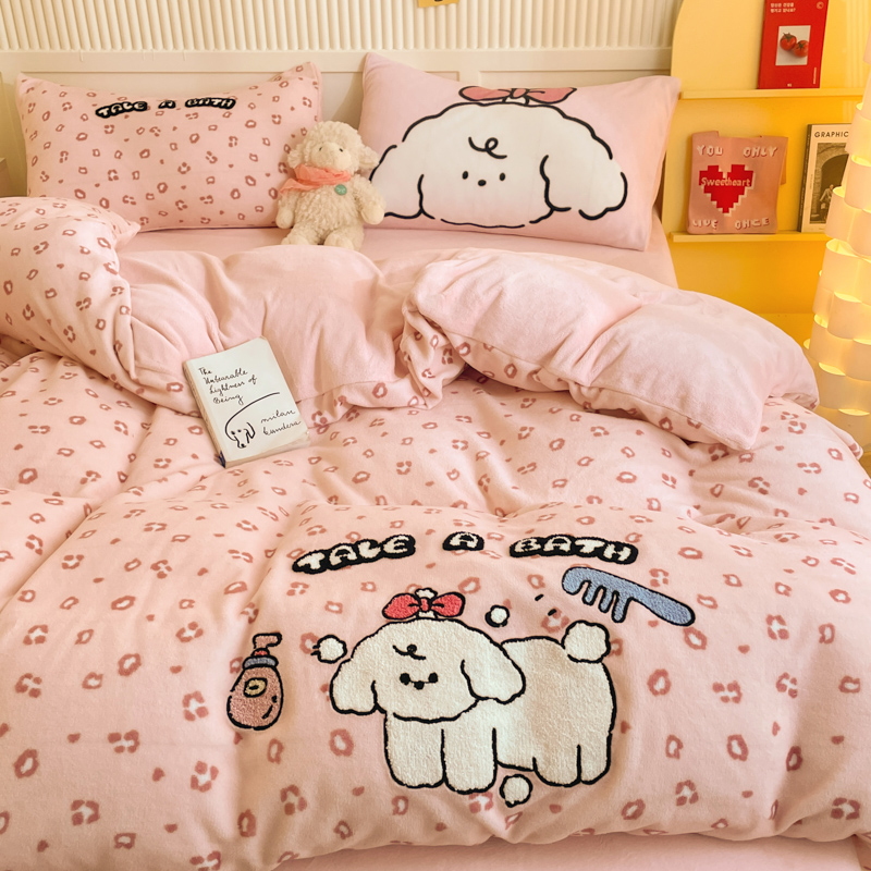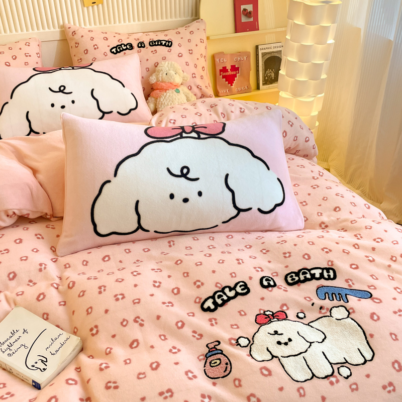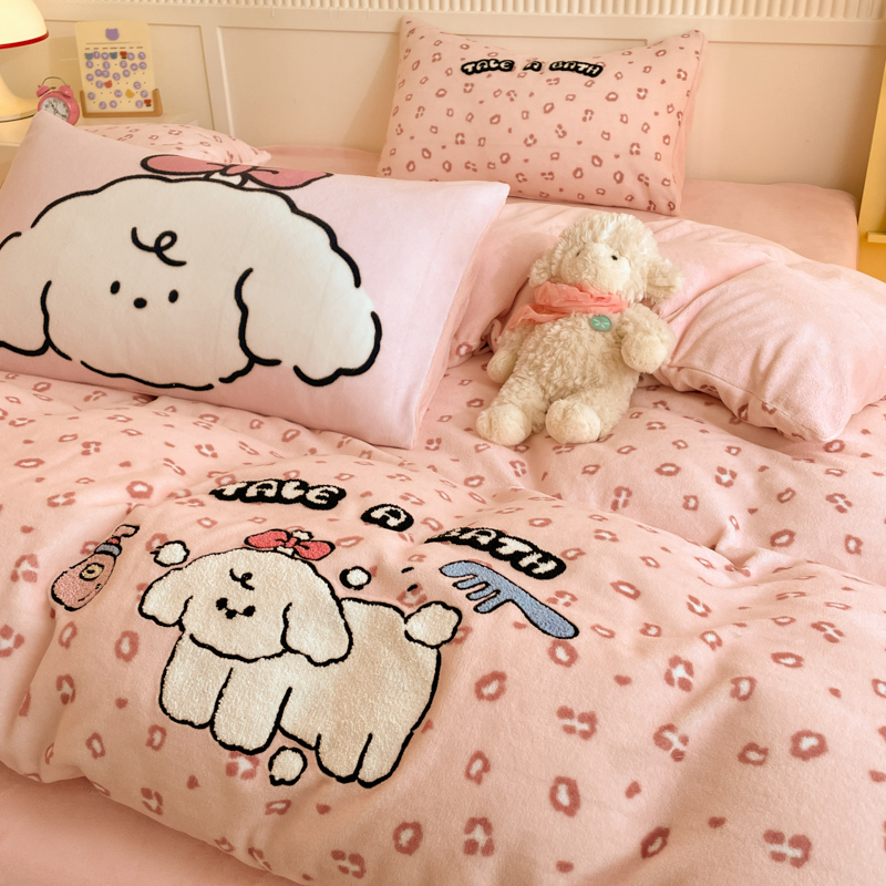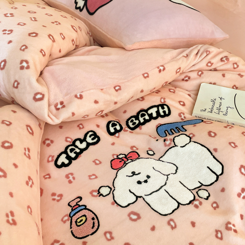 呗旺鹿 2024新款高克重卡通印花牛奶绒四件套毛巾绣牛奶绒四件套 爱洗澡的几米