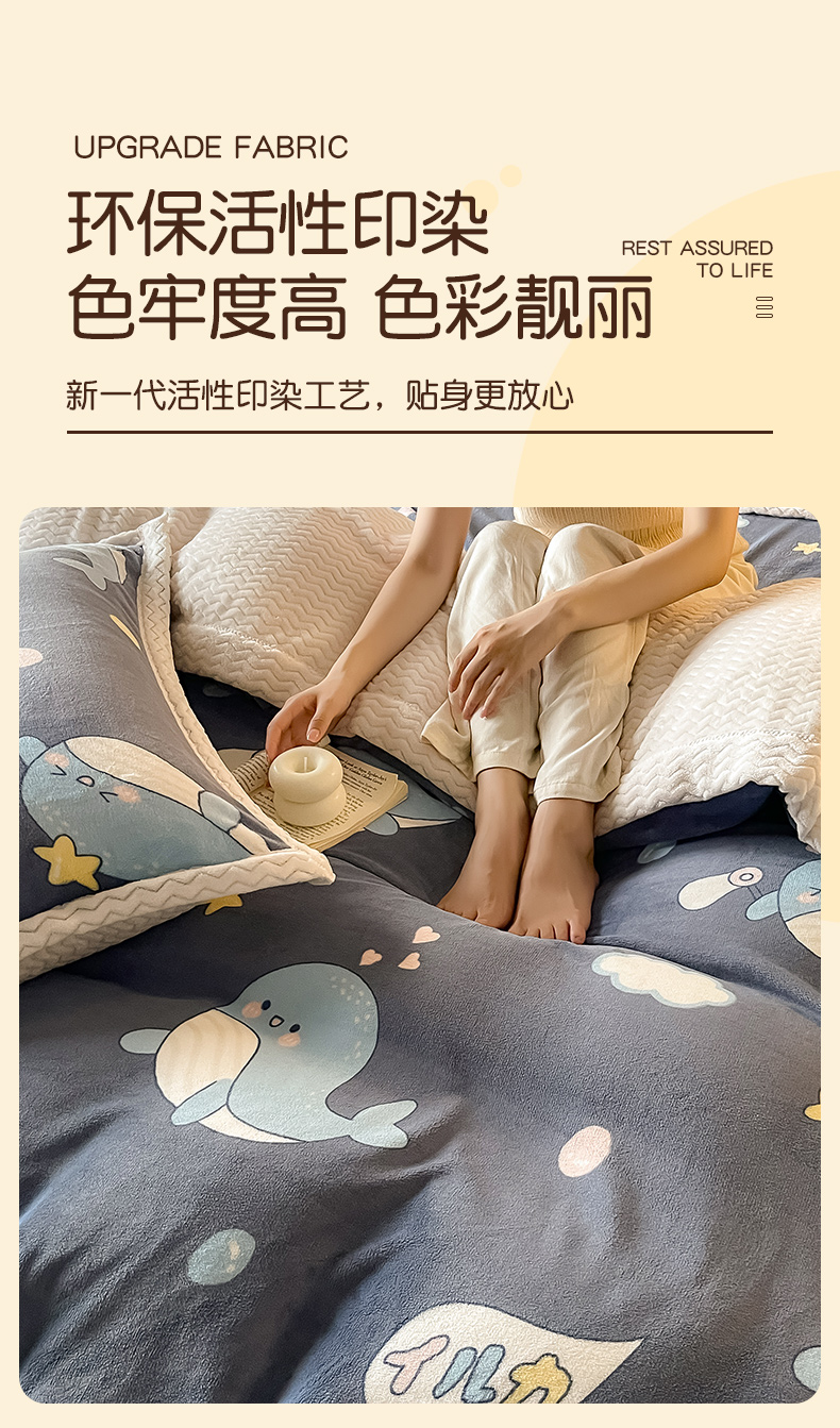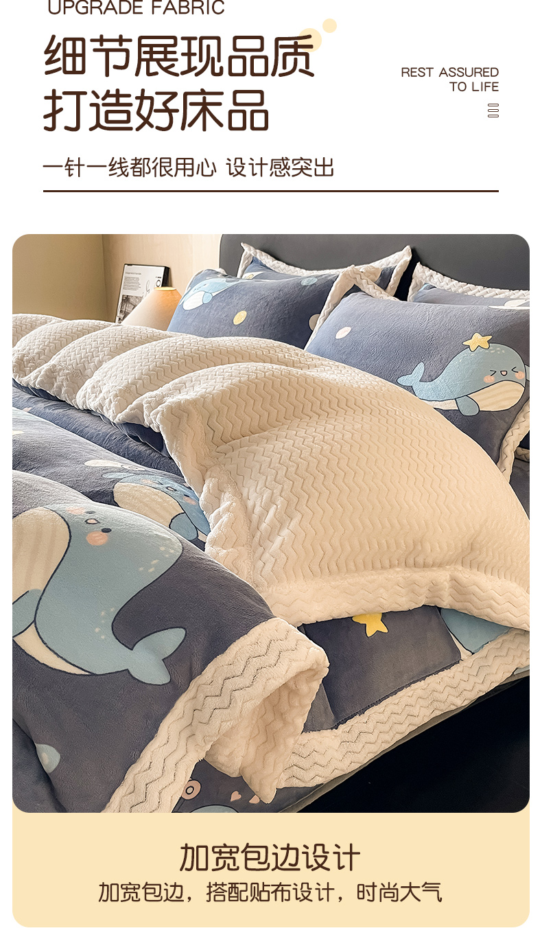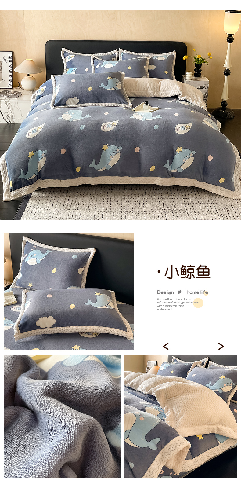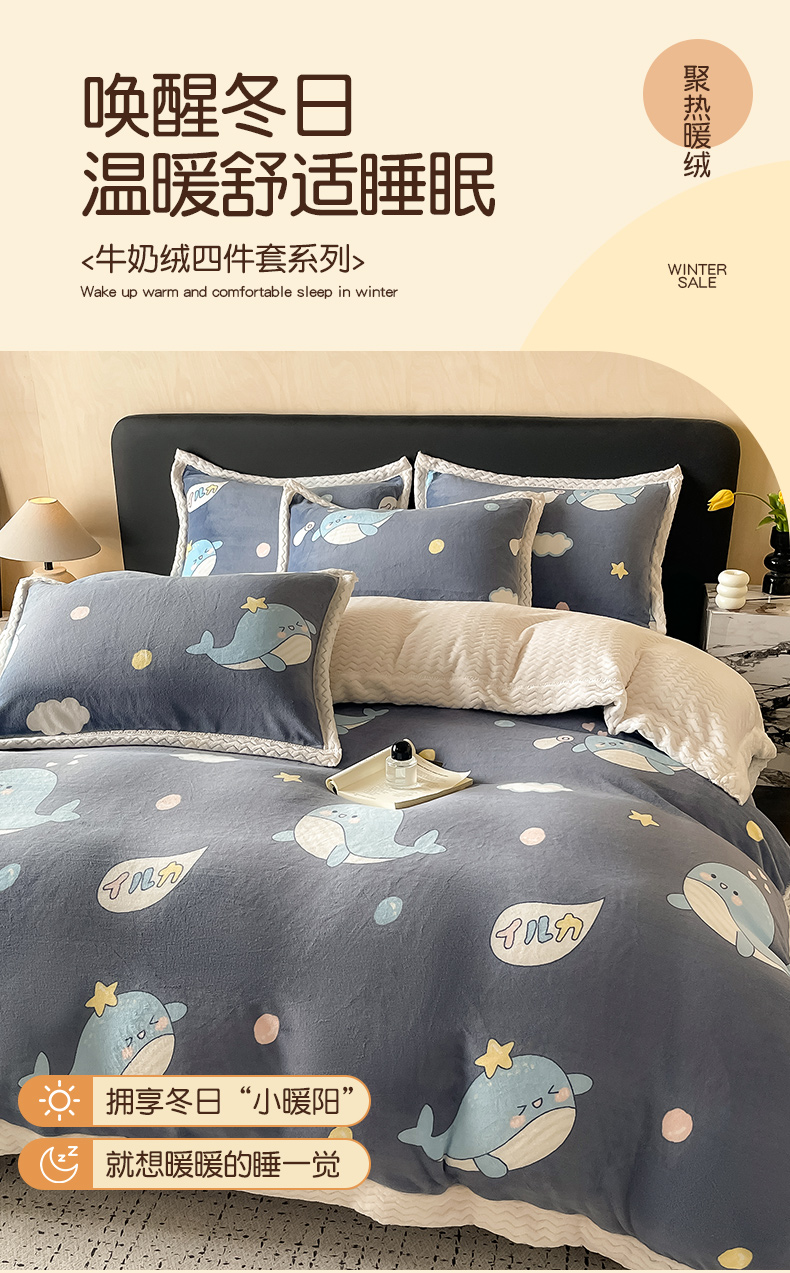 当前位置: 91家纺网 > 商品网购 > 床品套件 > 四件套 > 牛奶绒四件套 > 全季家居 2024新款A类纯色印花波浪大包边牛奶绒贝贝绒加厚保暖四件套 小鲸鱼