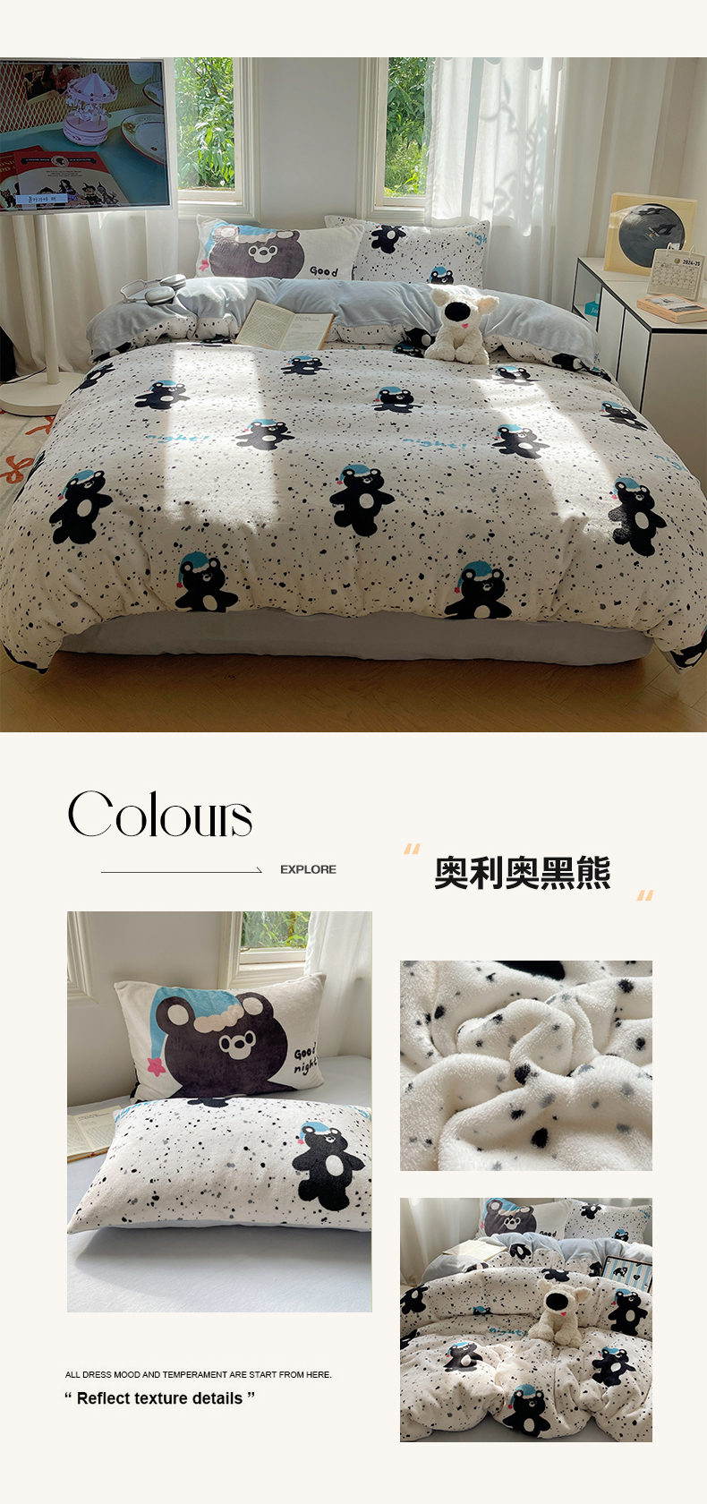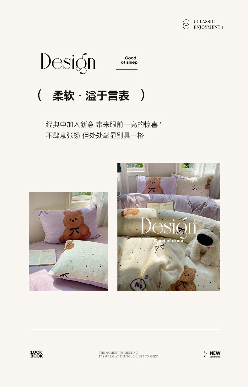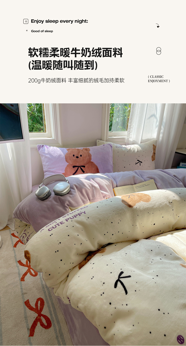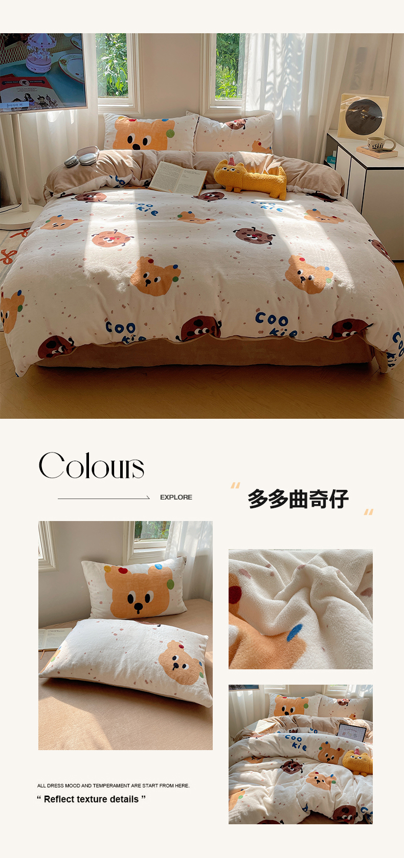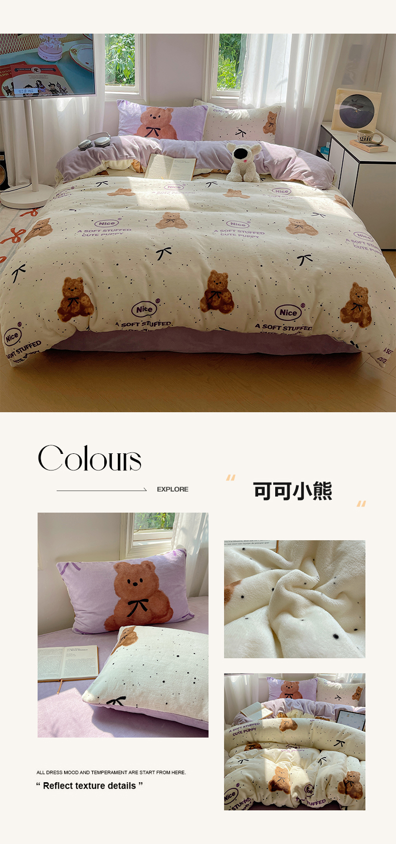 当前位置: 91家纺网 > 商品网购 > 床品套件 > 四件套 > 牛奶绒四件套 > 2024新款INS混搭版卡通牛奶绒四件套 可可小熊