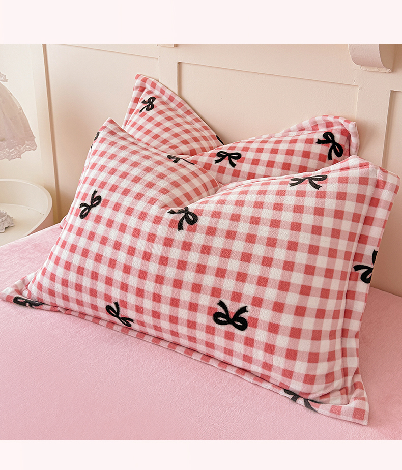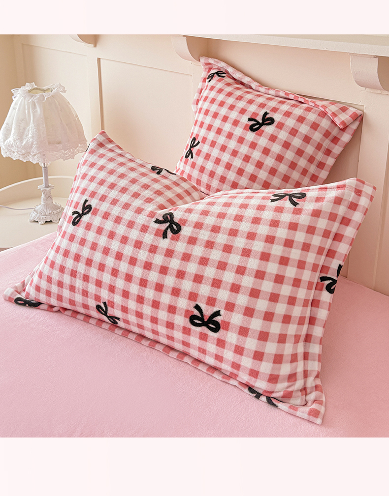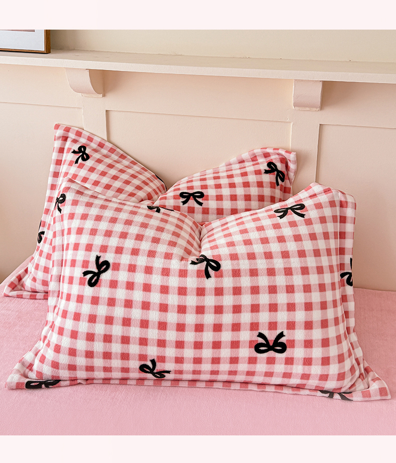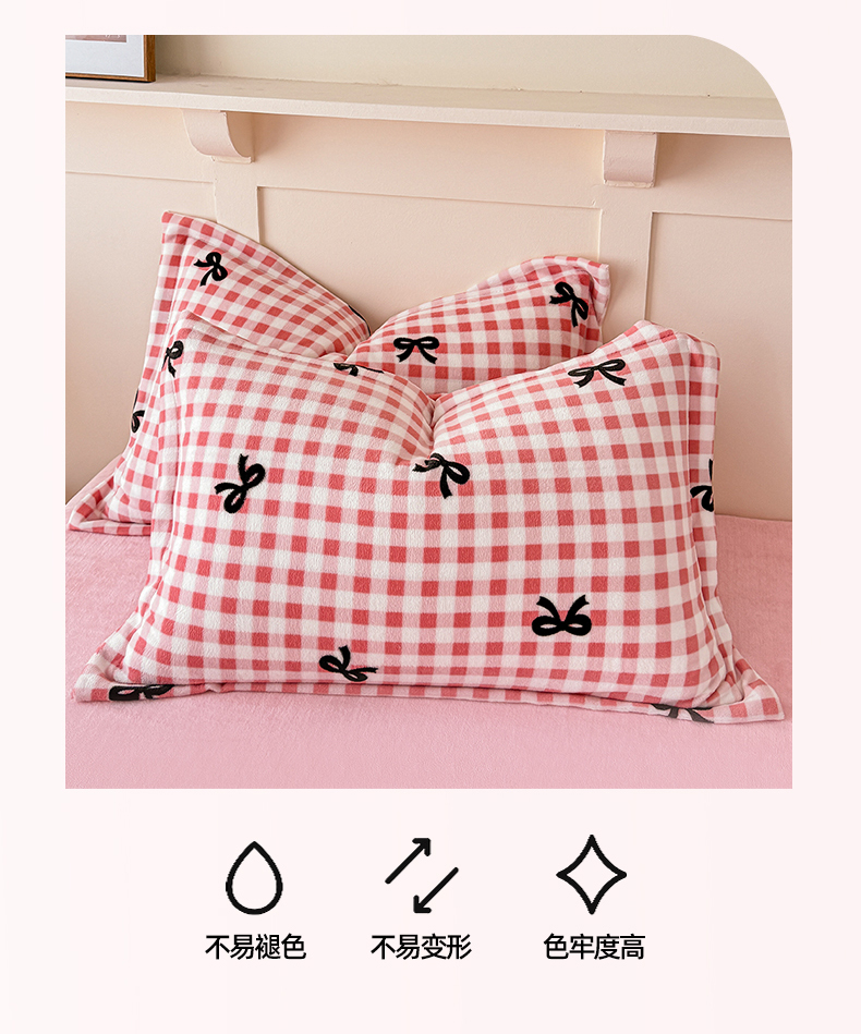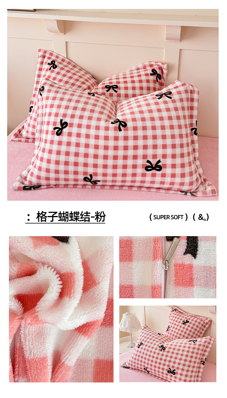 商品名称:妖妖家纺 2024新款200克牛奶绒单枕套 格子蝴蝶结-粉