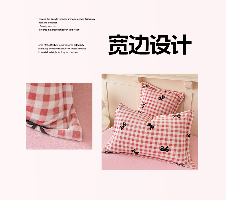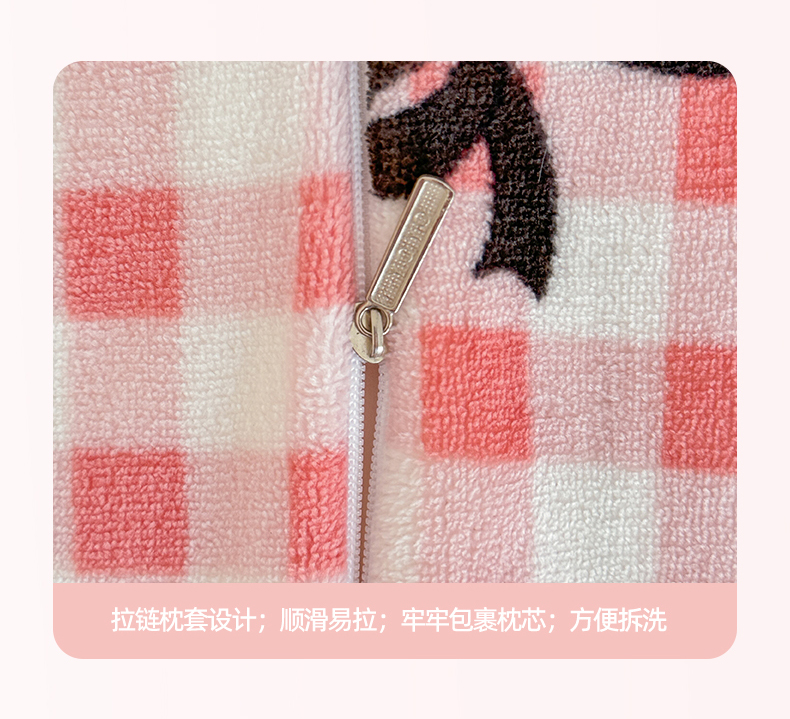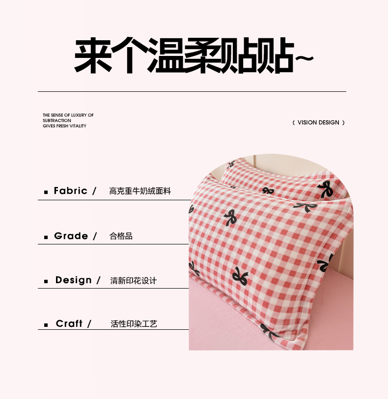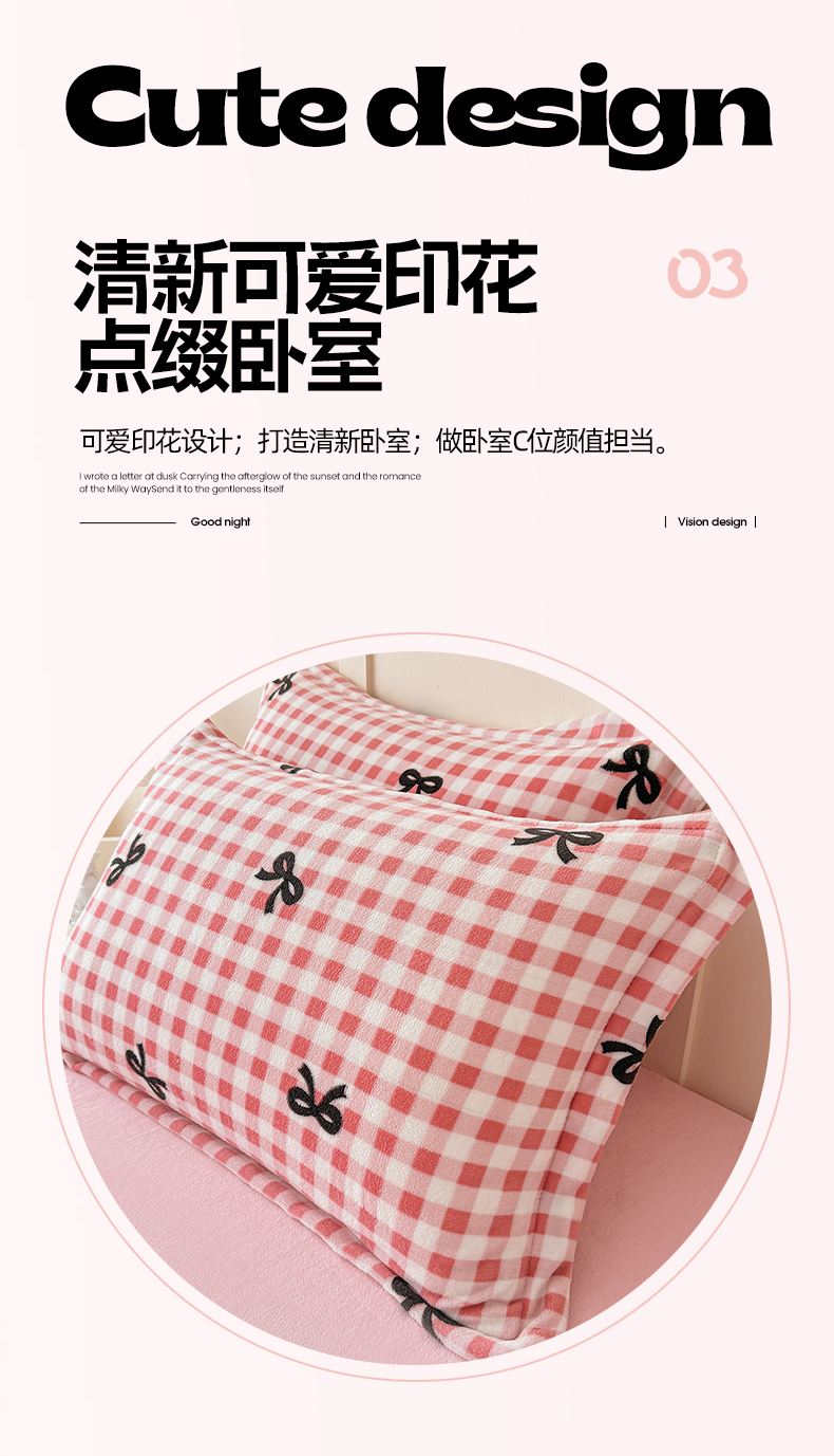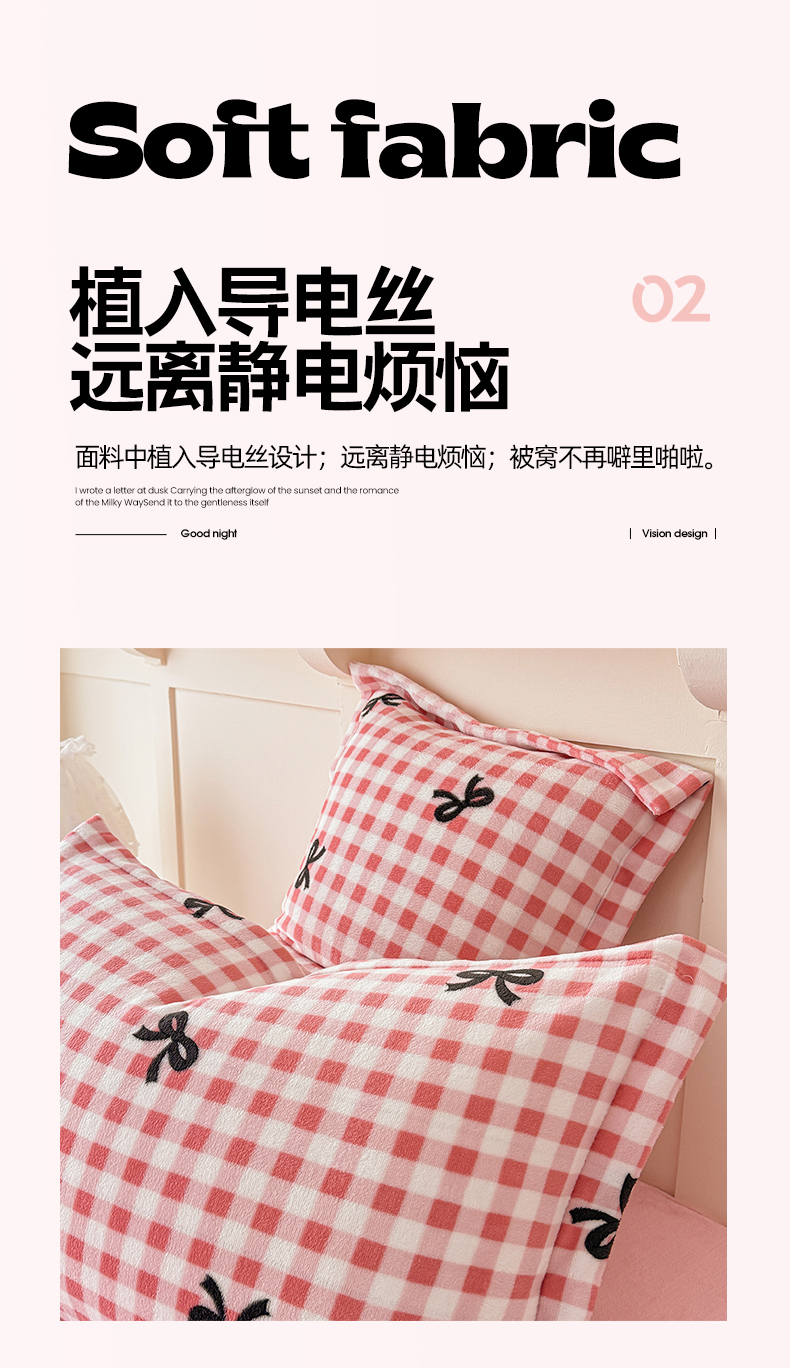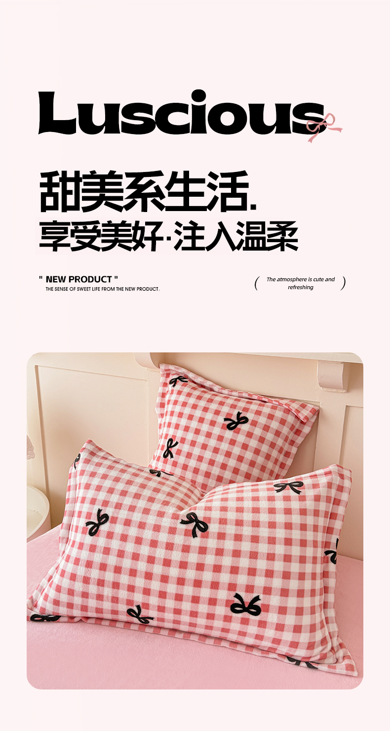商品名称:妖妖家纺 2024新款200克牛奶绒单枕套 格子蝴蝶结-粉