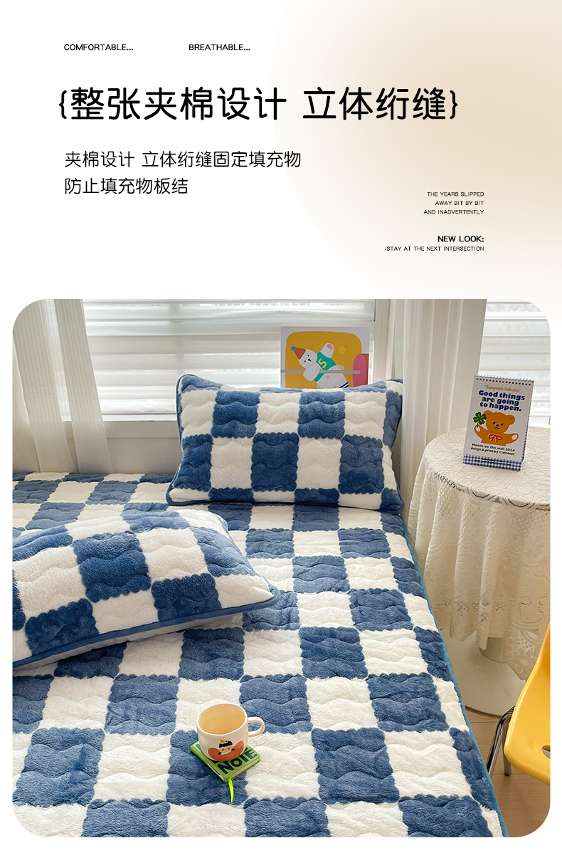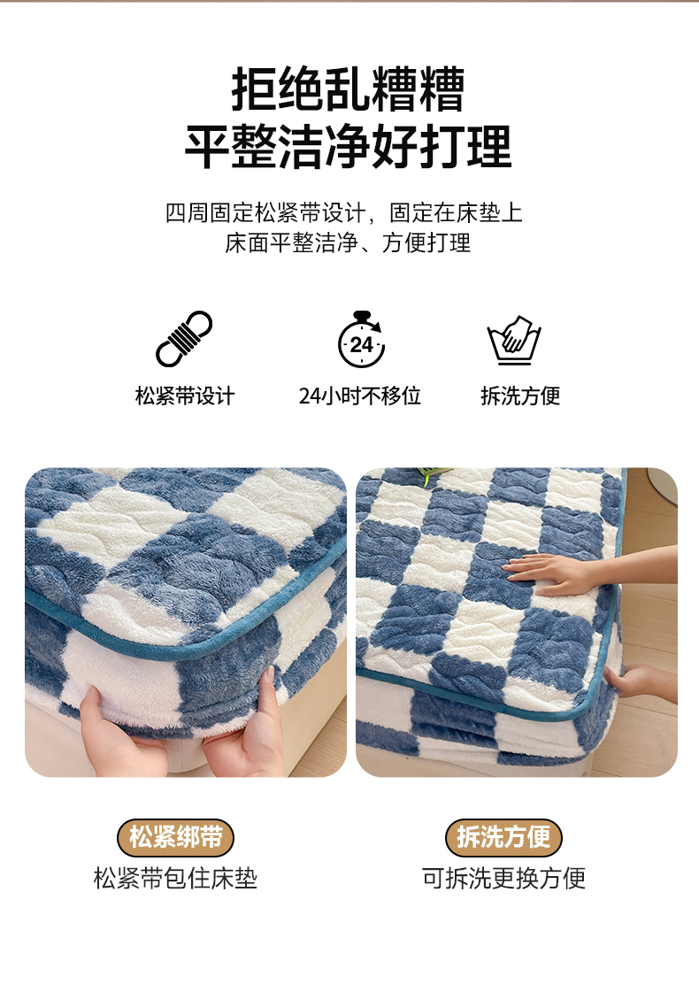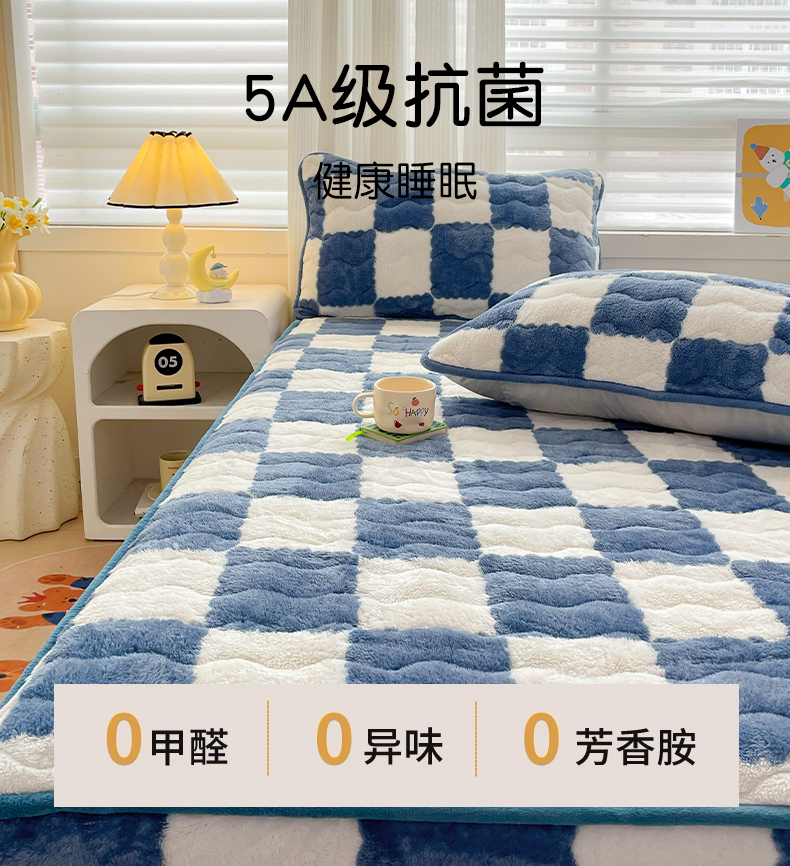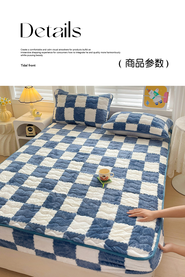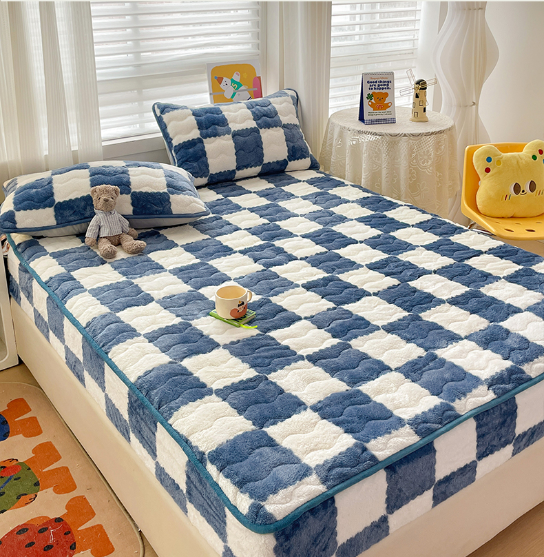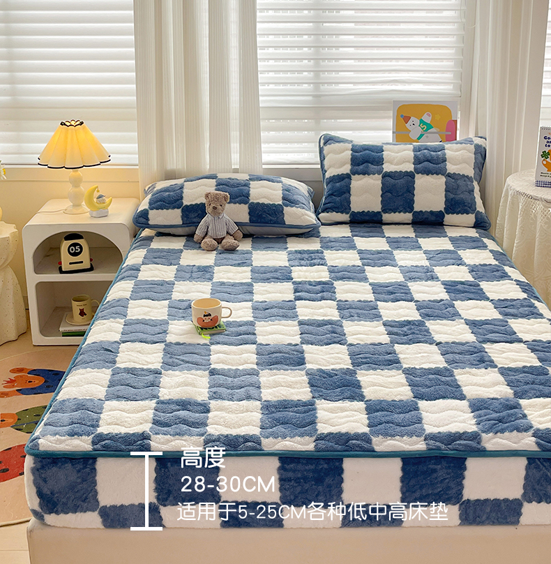 • 91家纺网 家纺一手货源 找家纺 叠派家纺 2024款秋冬北极绒加厚夹棉床笠三件套印花泰迪绒床垫保护罩-格子系列 蓝