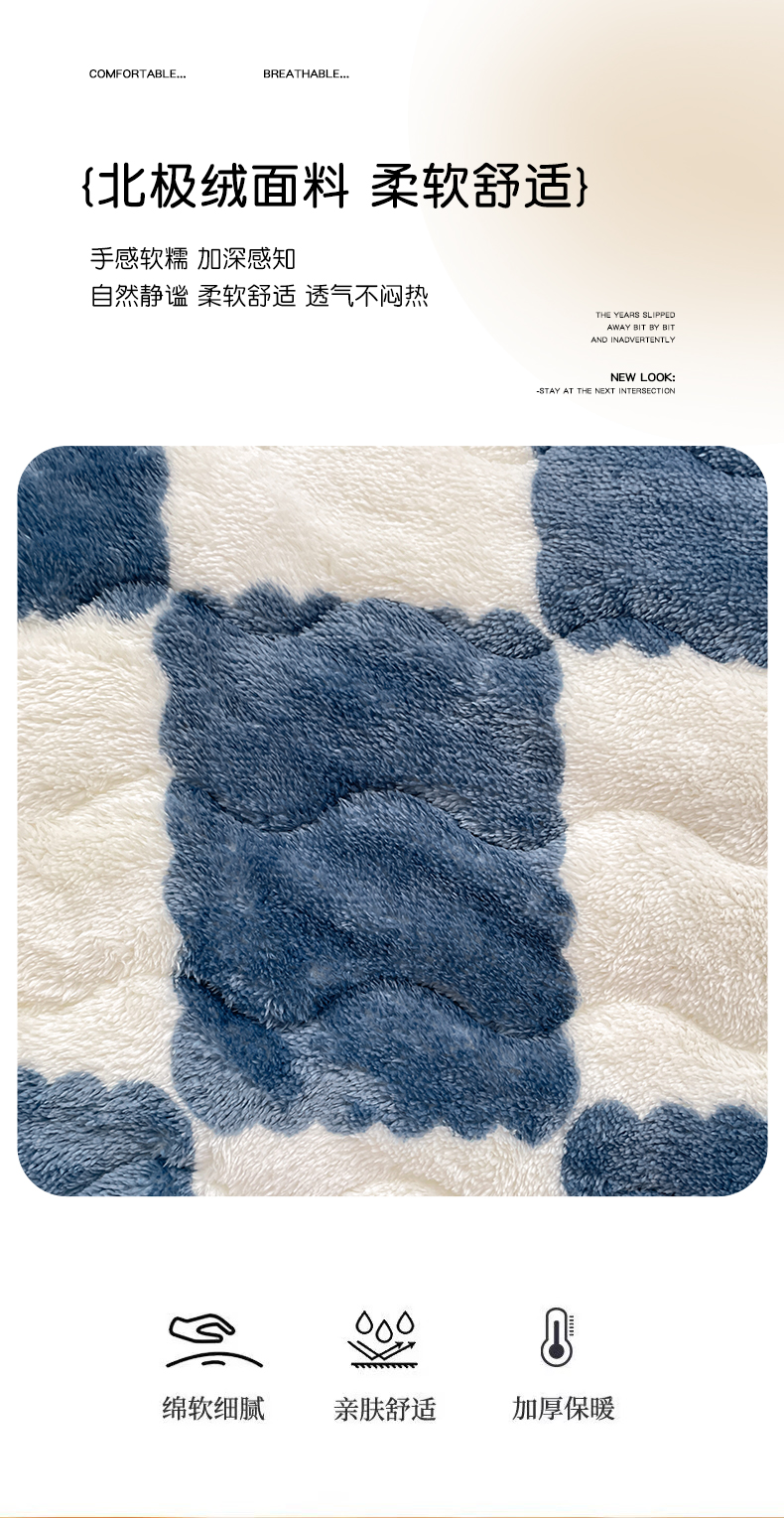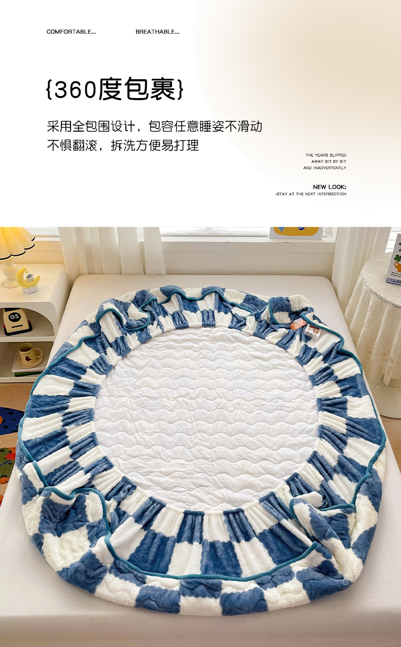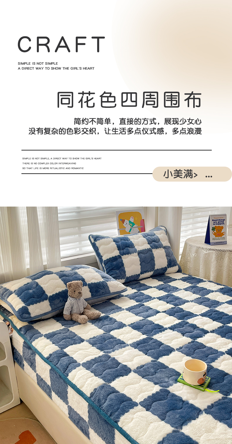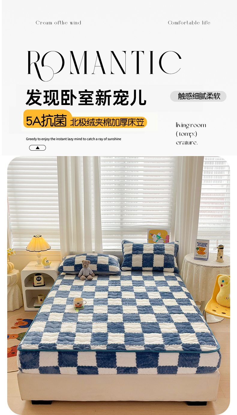 • 91家纺网 家纺一手货源 找家纺 叠派家纺 2024款秋冬北极绒加厚夹棉床笠三件套印花泰迪绒床垫保护罩-格子系列 蓝