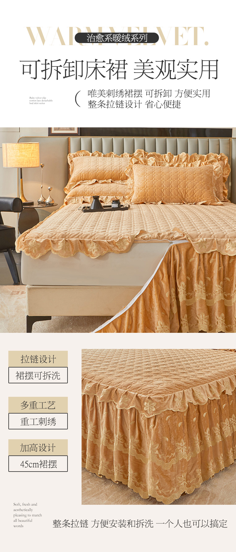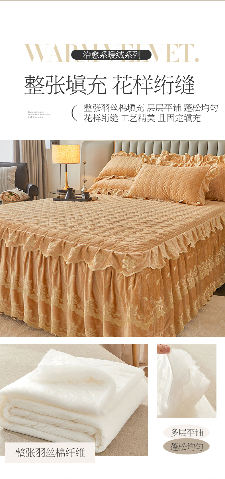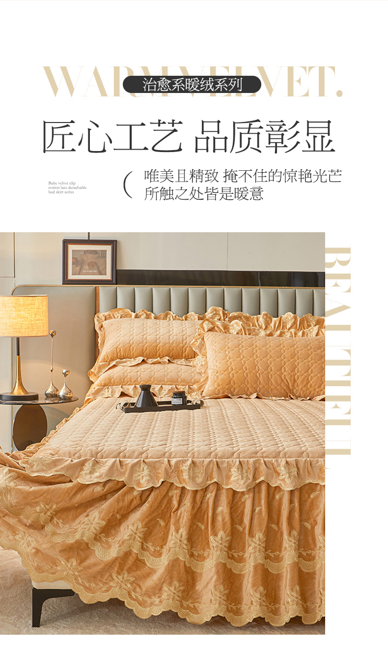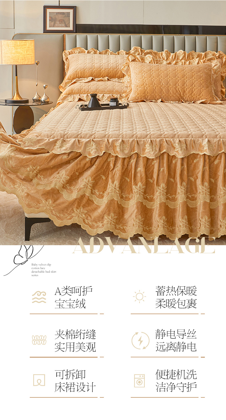 • 91家纺网 家纺一手货源 找家纺 虹星家纺 2024新款可拆卸宝宝绒夹棉床裙三件套-盛世芳华 盛世芳华 暖杏