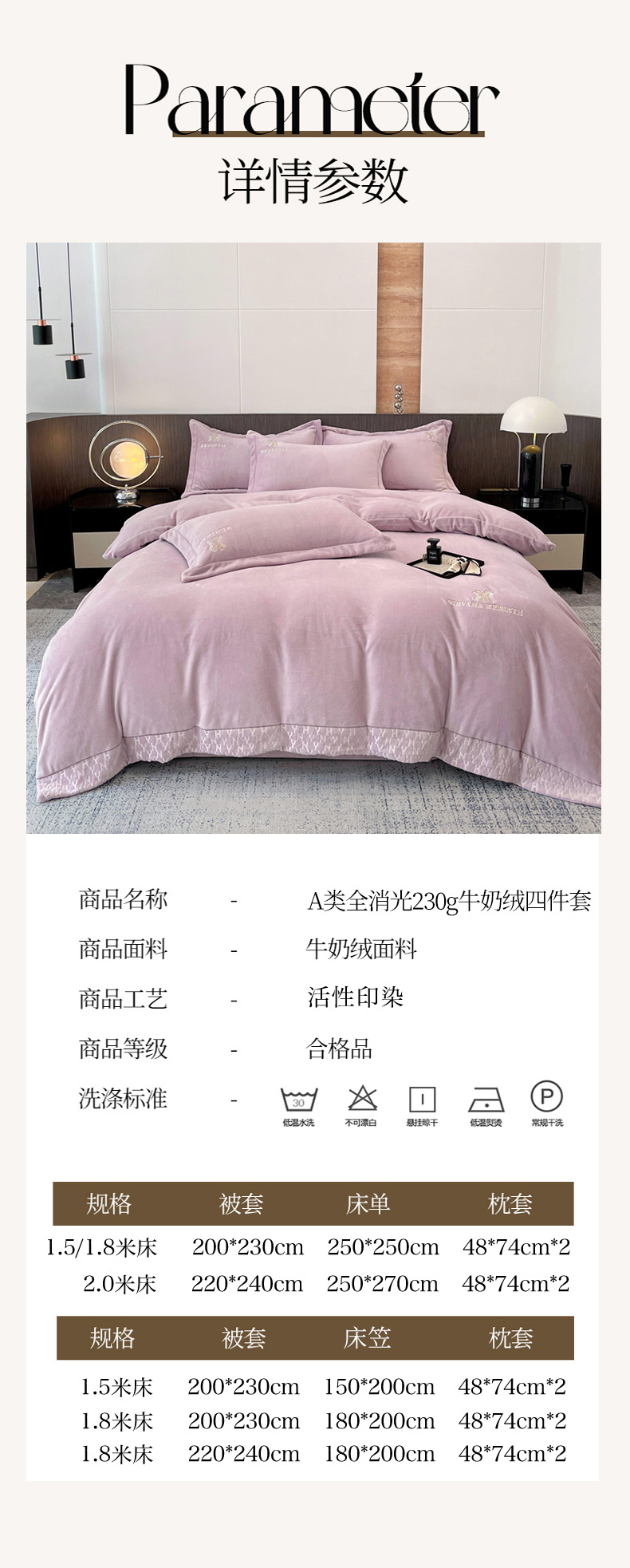商品名称:星尚家纺 2024新款全消光A类230g牛奶绒四件套-维也纳 香芋紫