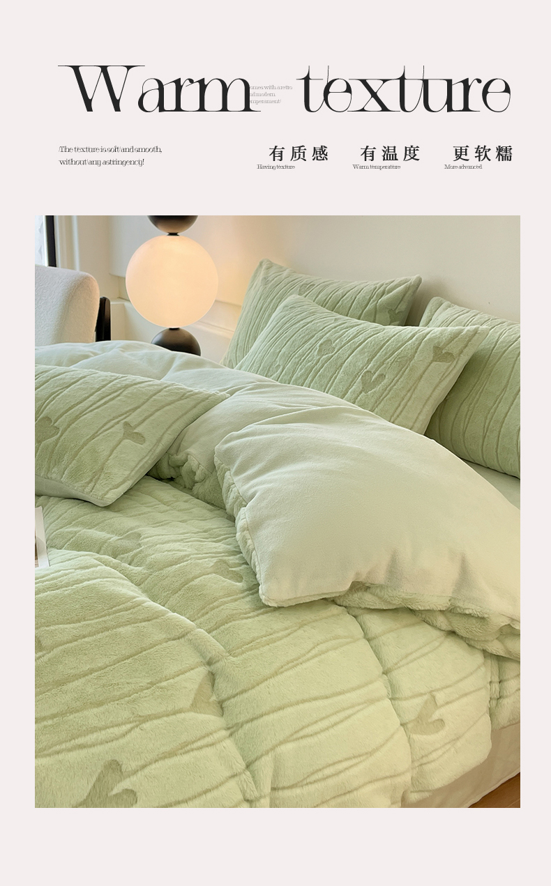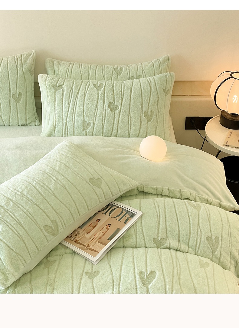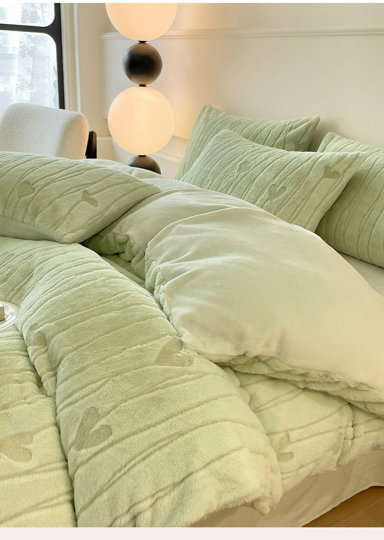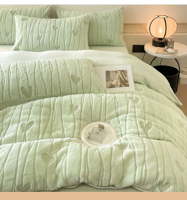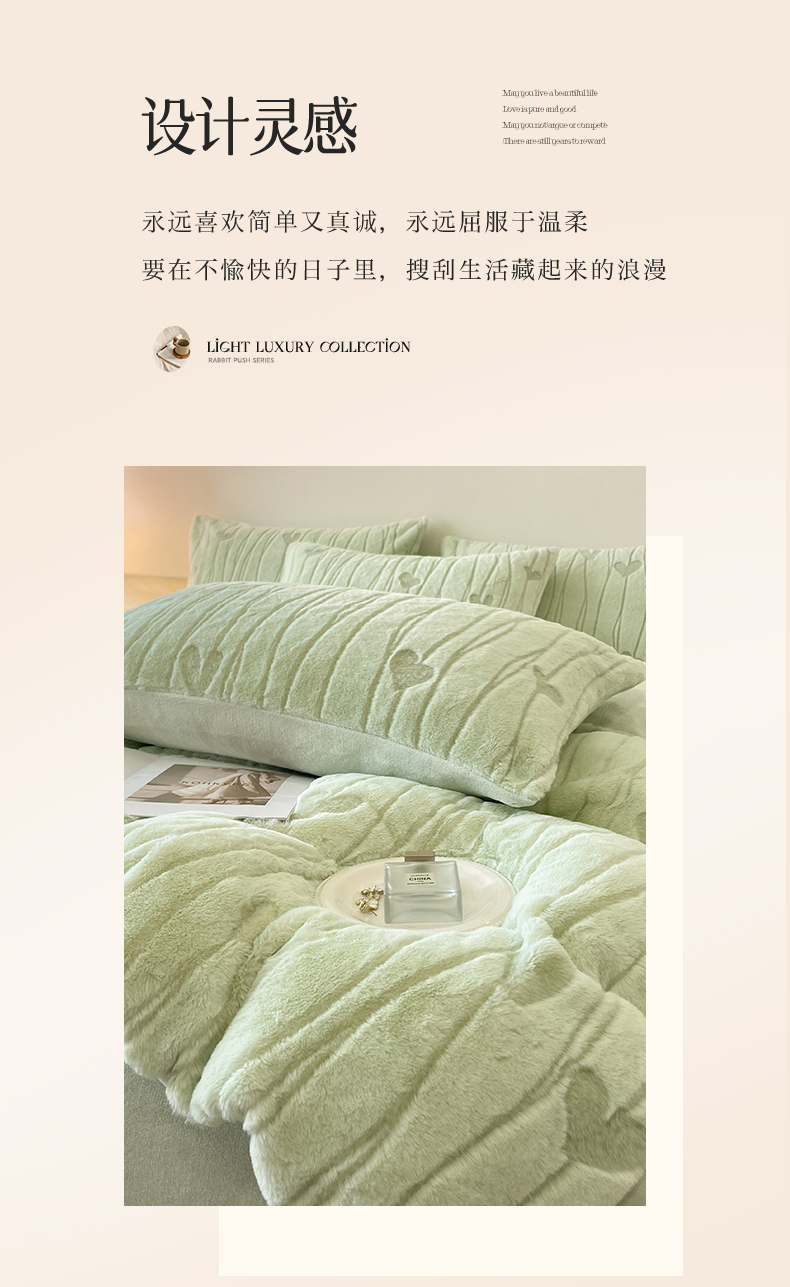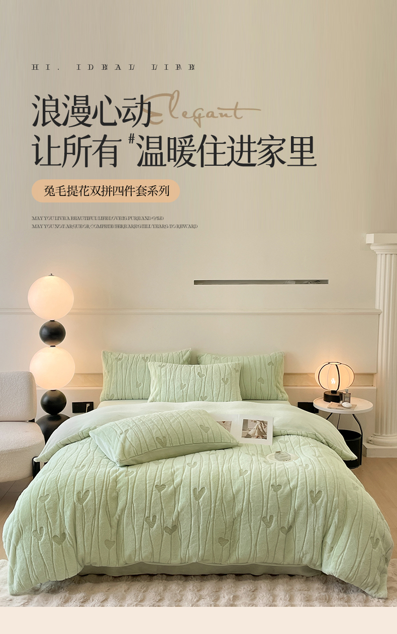 商品名称:798家纺 2025新款兔毛提花双拼四件套-简爱系列 心恋-豆绿