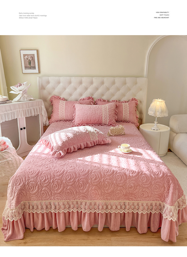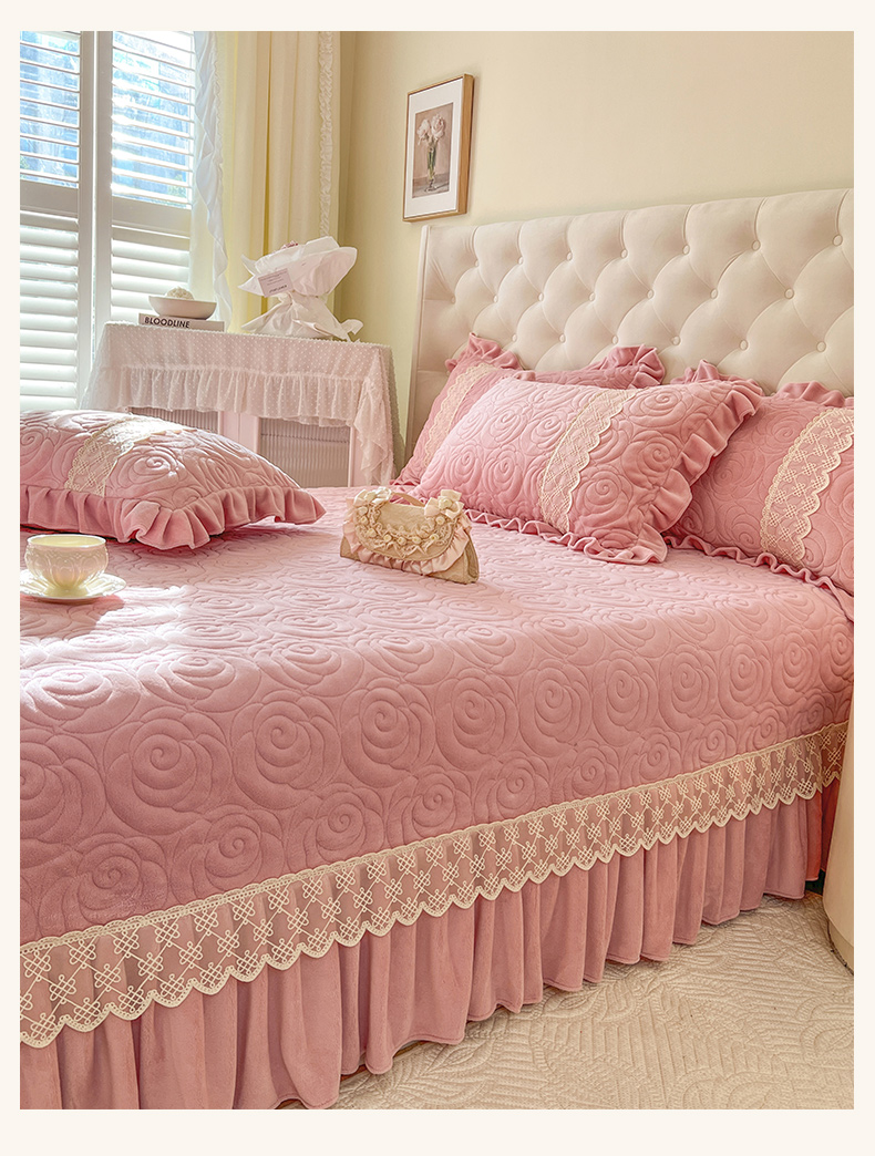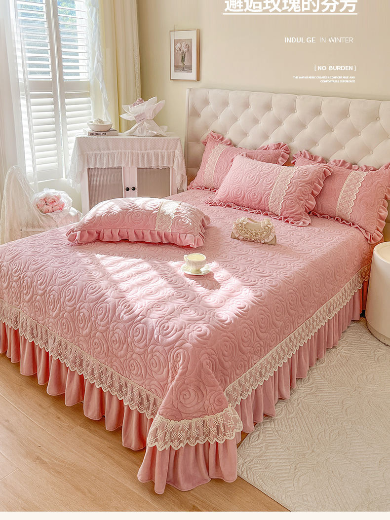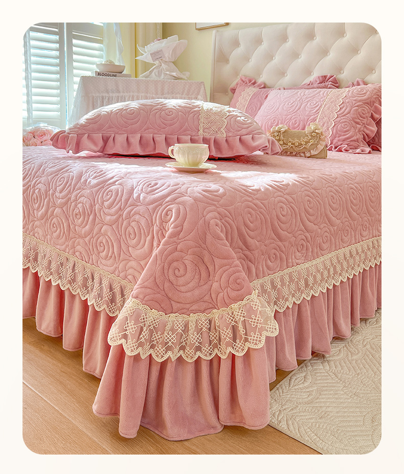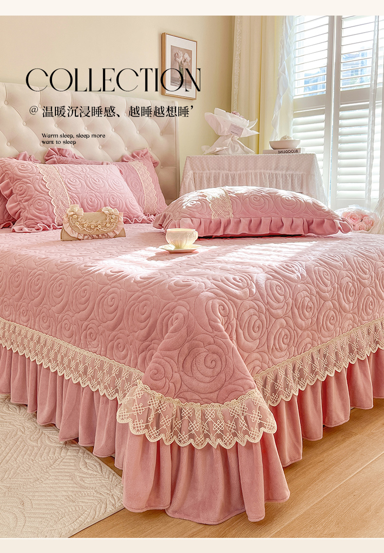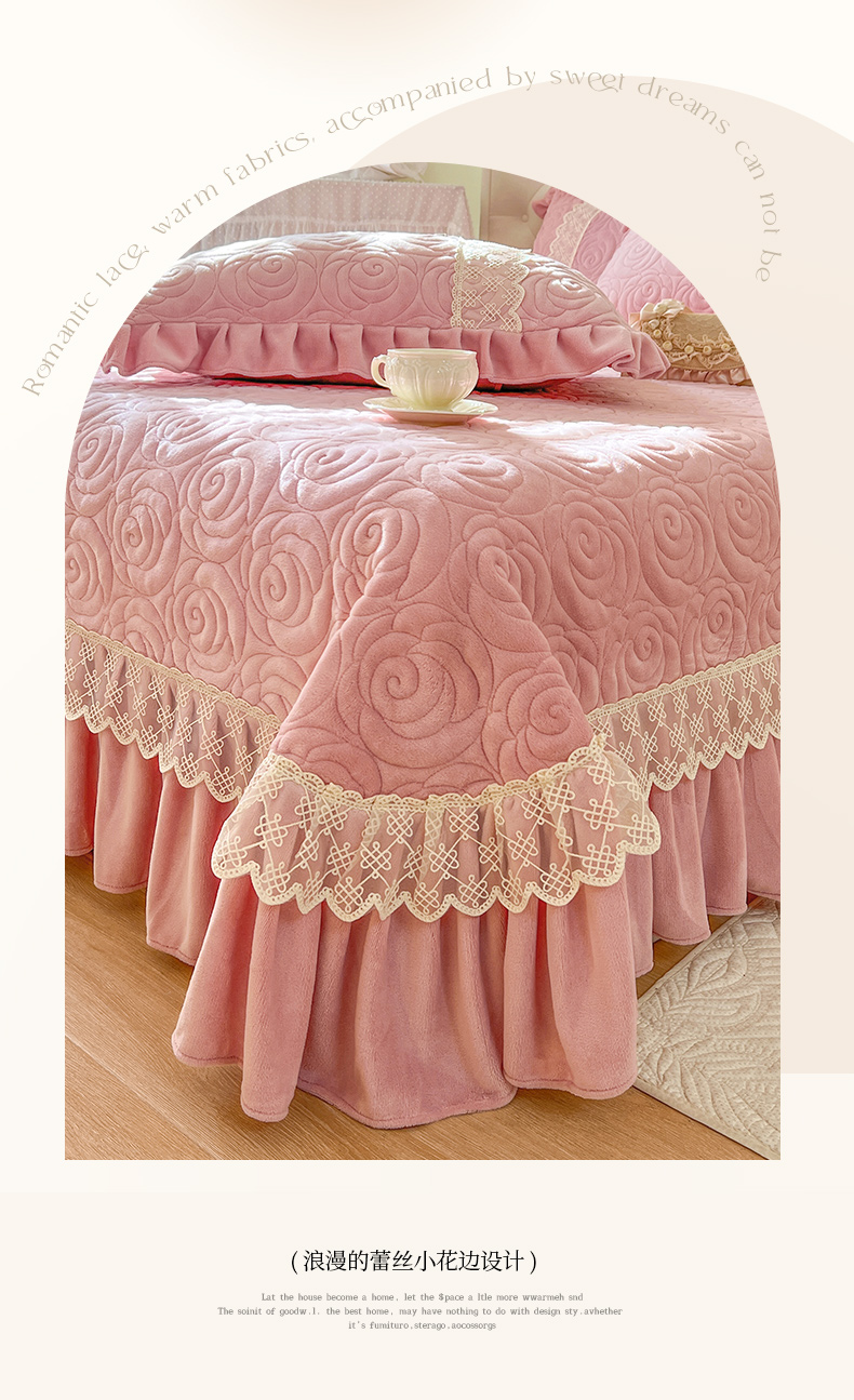 商品名称:恋尚 2024新款高克重牛奶绒夹棉蕾丝花边单床盖--朵拉 朵拉-蜜桃粉