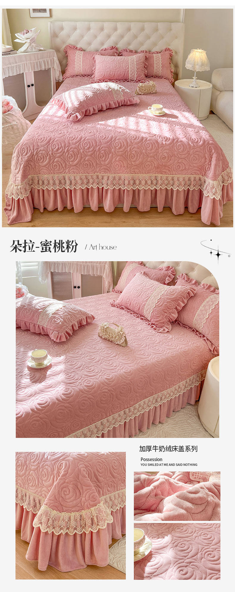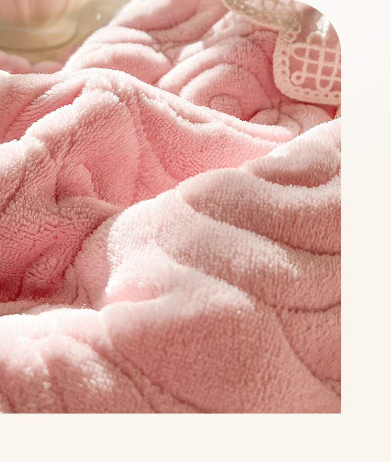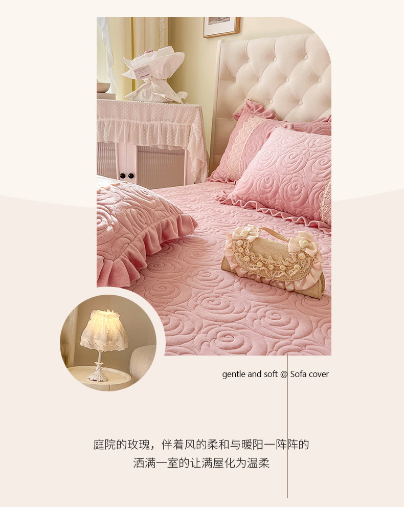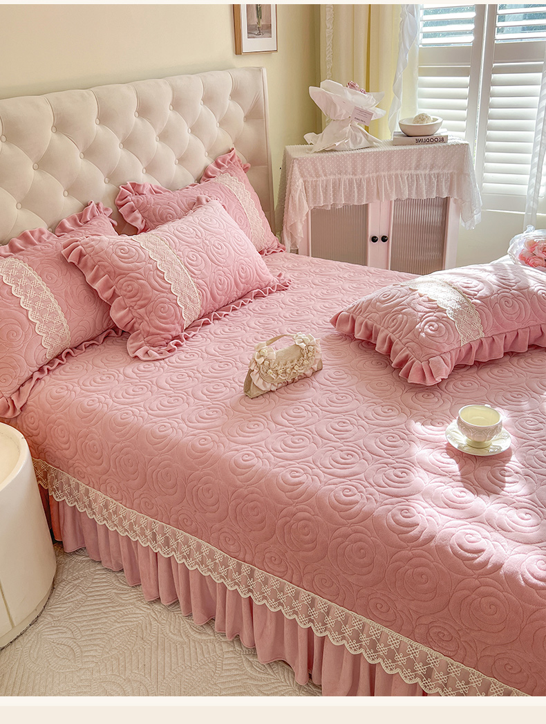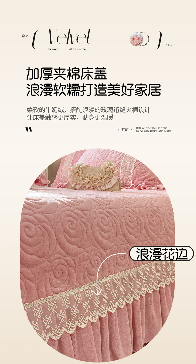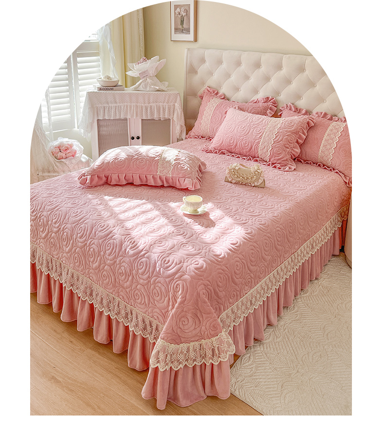 商品名称:恋尚 2024新款高克重牛奶绒夹棉蕾丝花边单床盖--朵拉 朵拉-蜜桃粉