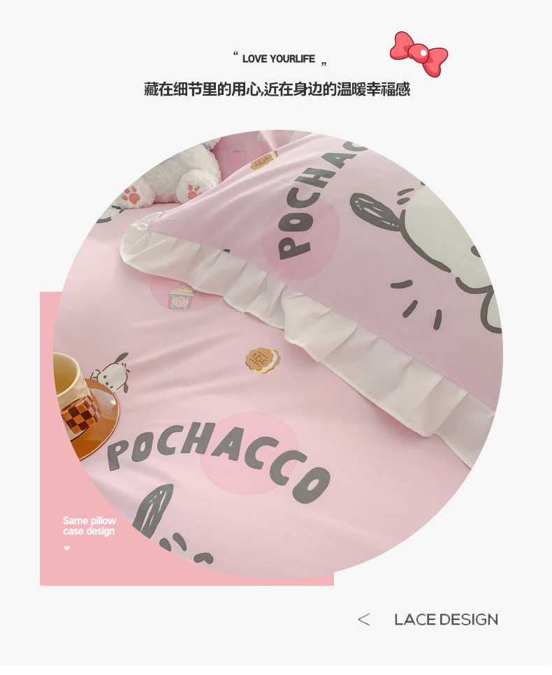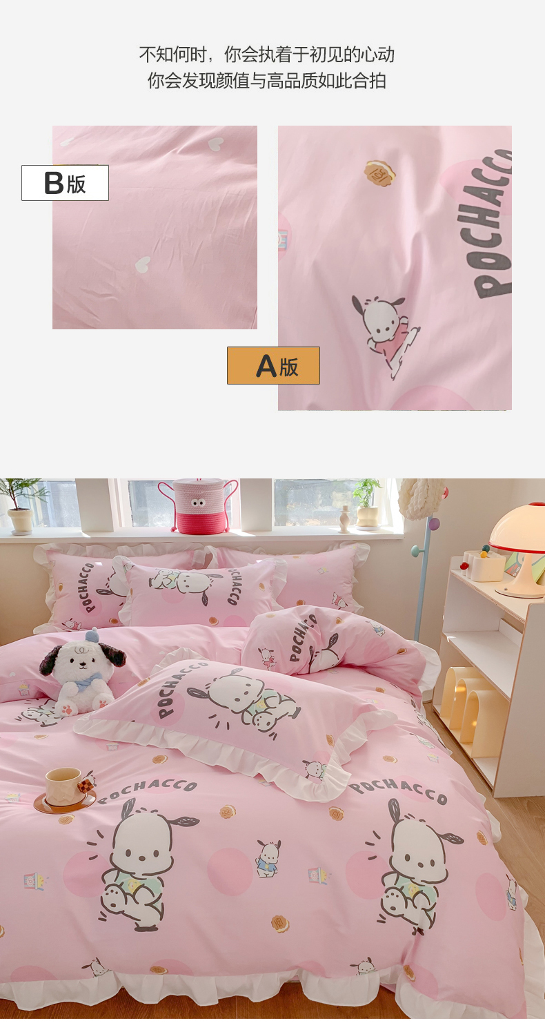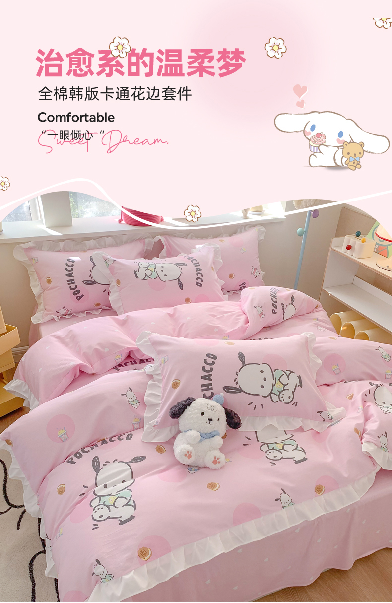 当前位置: 91家纺网 > 商品网购 > 床品套件 > 四件套 > 全棉普通四件套 > 玉元坊 2025新款三丽鸥系列白花边被套纯棉全棉床裙三件套四件套-帕恰狗白花边款式 开心帕恰狗【花边款式】