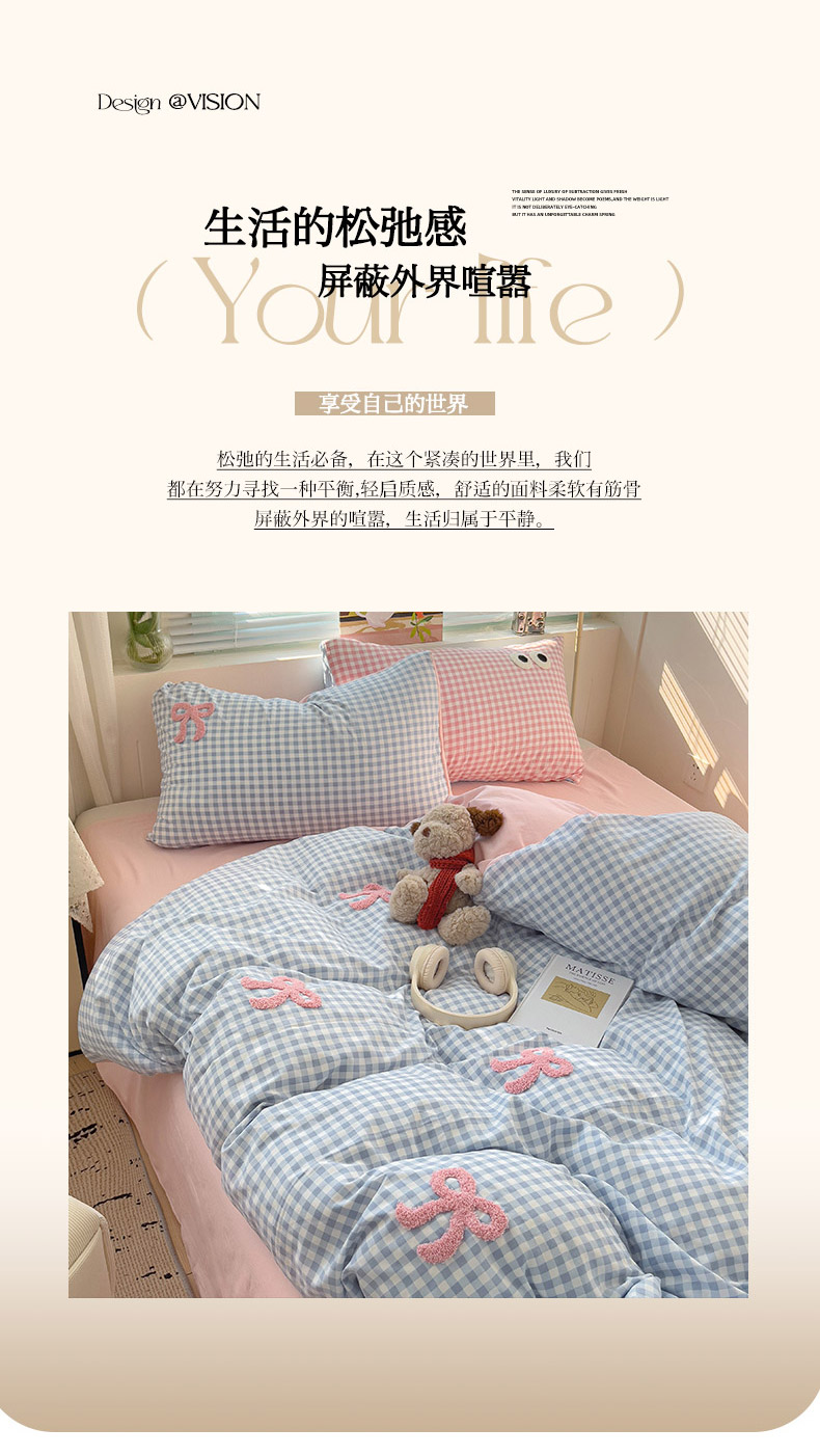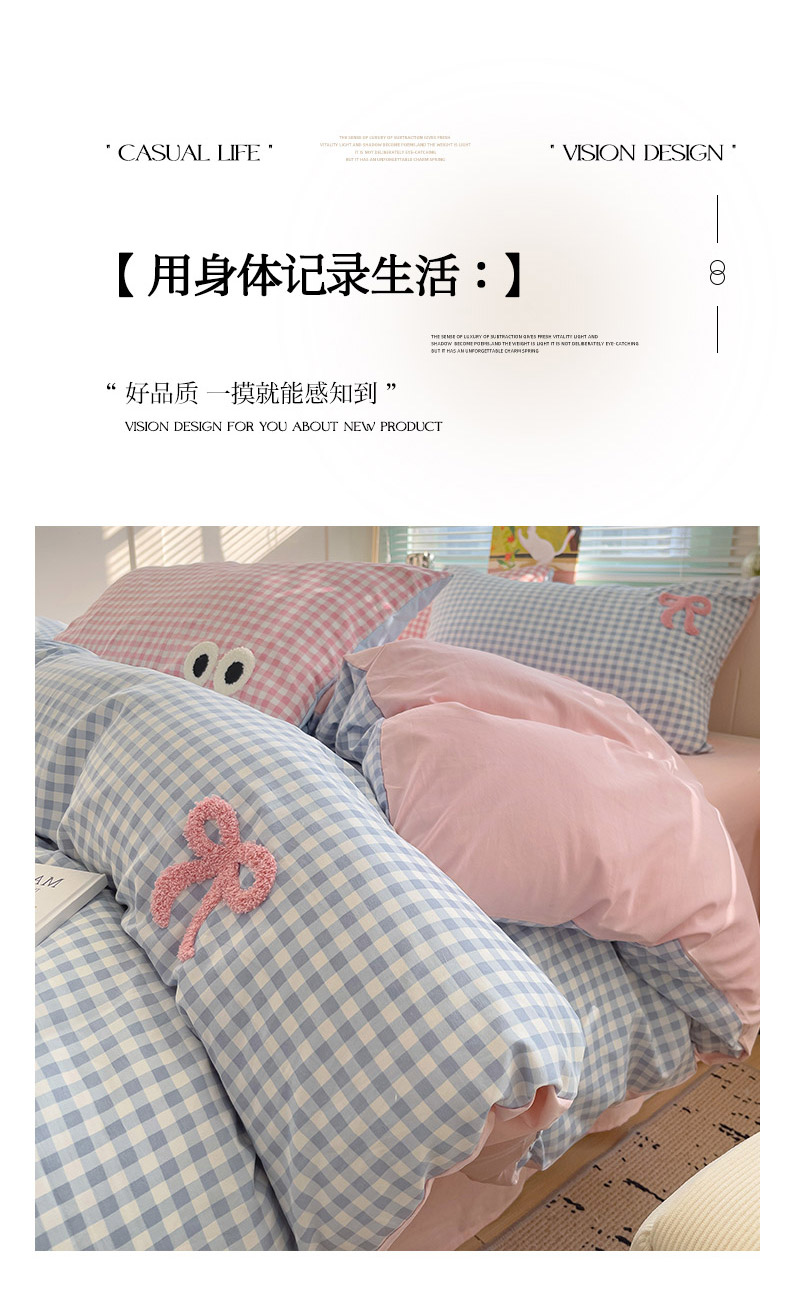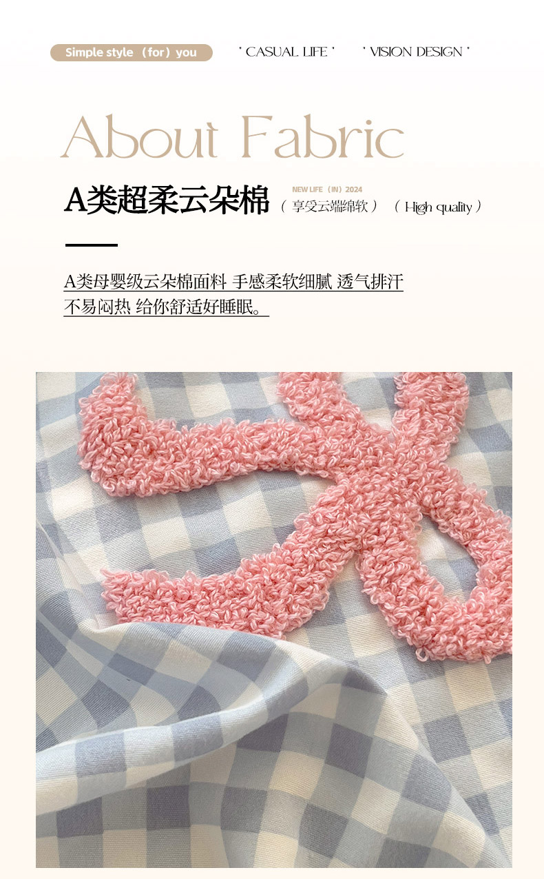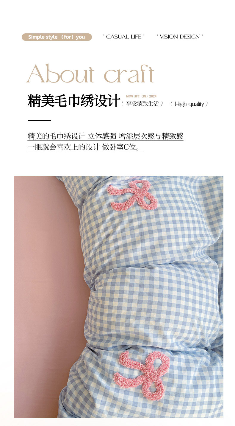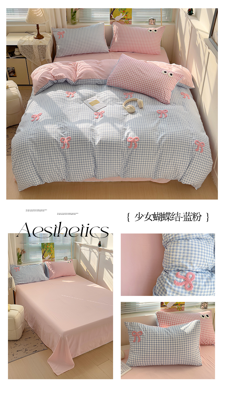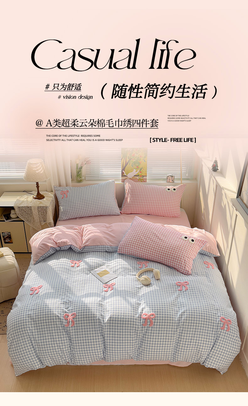 当前位置: 91家纺网 > 商品网购 > 床品套件 > 四件套 > 水洗棉四件套 > 妖妖家纺 2025新款水洗云朵毛巾绣印+绣系列四件套 少女蝴蝶结-蓝粉