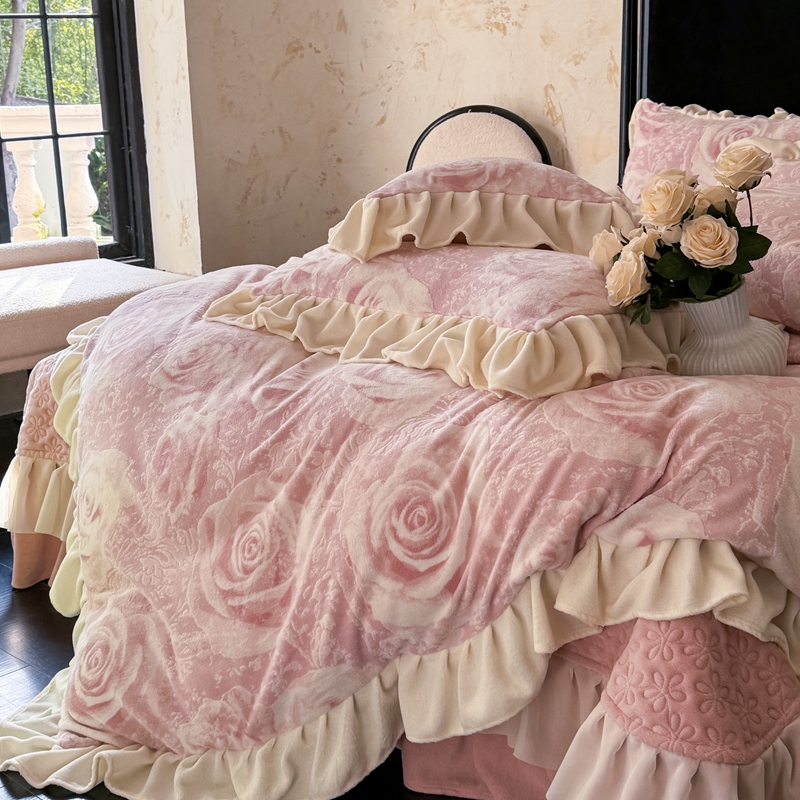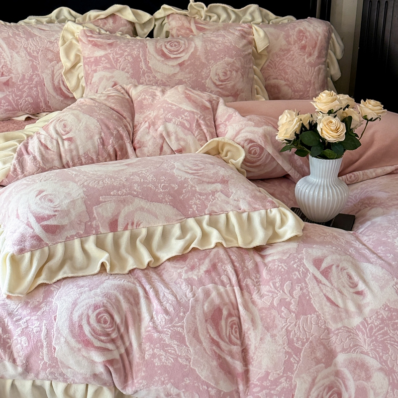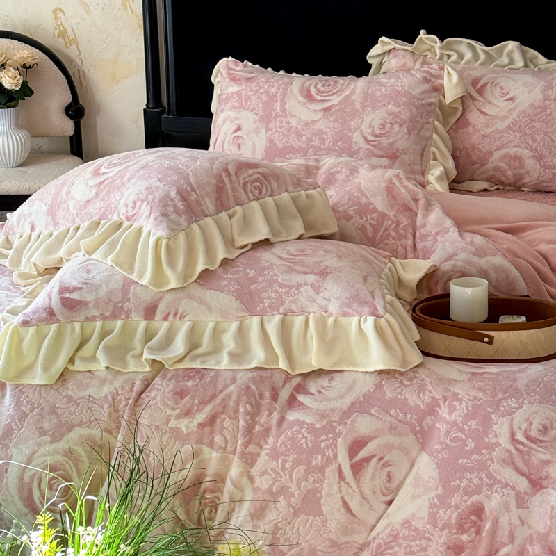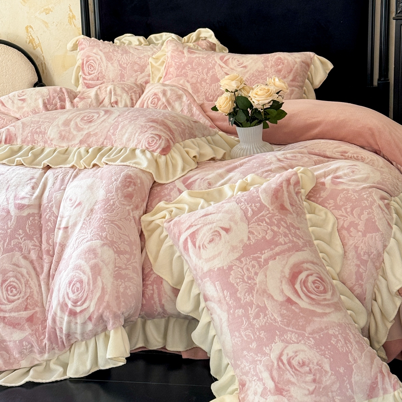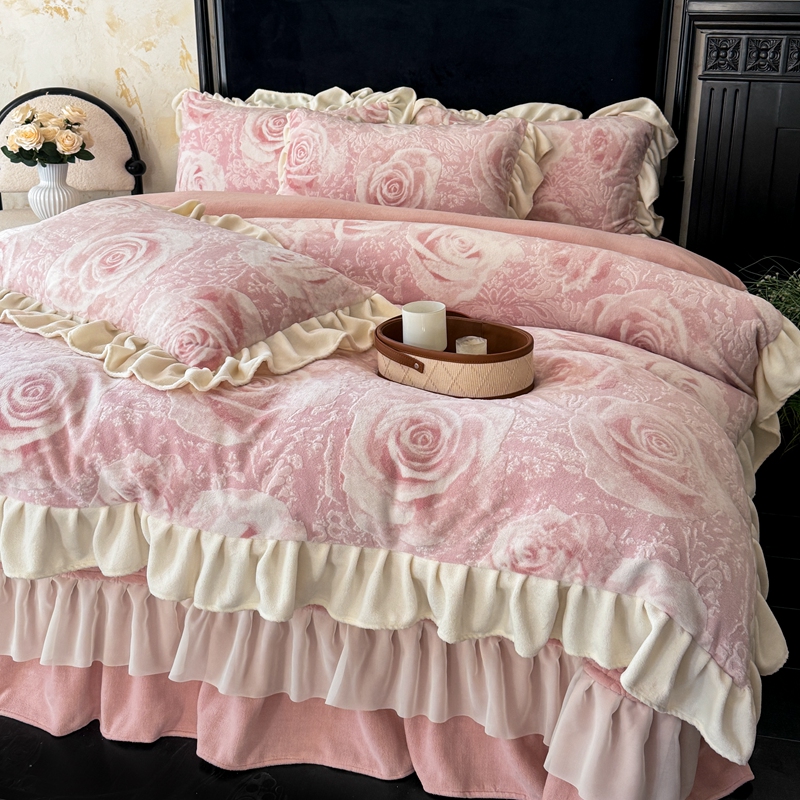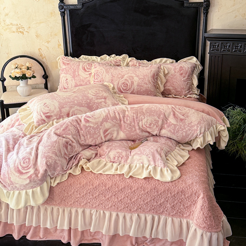 商品名称:大麦家纺 2024新款高克重牛奶绒夹棉床盖四件套 玫瑰粉