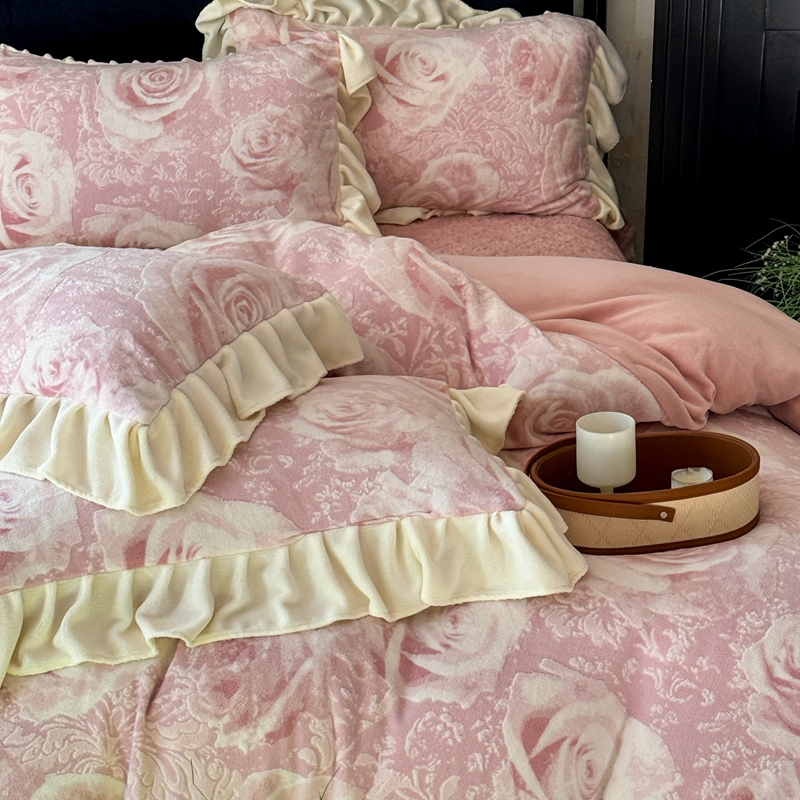 大麦家纺 2024新款高克重牛奶绒夹棉床盖四件套 玫瑰粉