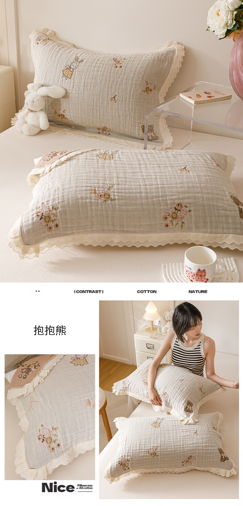 麻依 2025新款棉花糖枕巾全棉四层纱布双层花边 抱抱熊