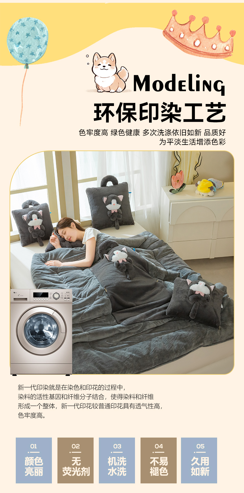 (总)雷娜家居 2025款加厚牛奶绒Happy Toast贴布绣抱枕被,藏青,橙橘,豆绿,海蓝,湖绿,暖玉色,深灰,温柔紫