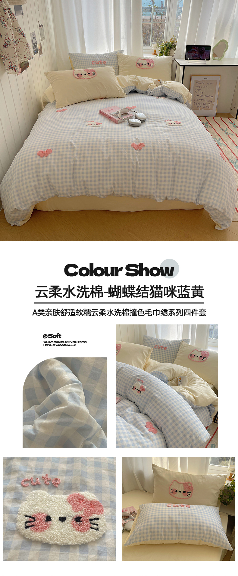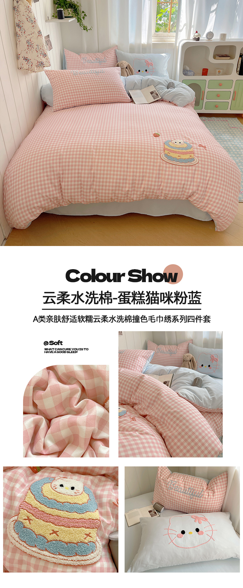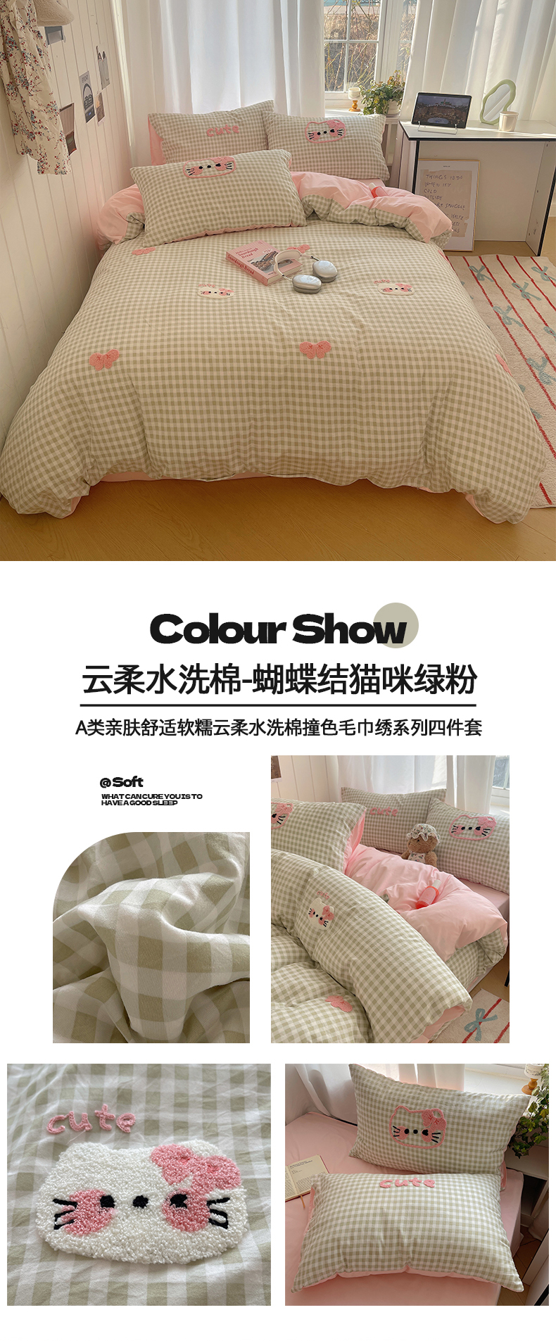 商品名称:(总)桃心家居 2025新款A类亲肤舒适软糯云柔水洗棉奶油格子撞色毛巾绣猫咪蝴蝶结水洗棉系列四件套
