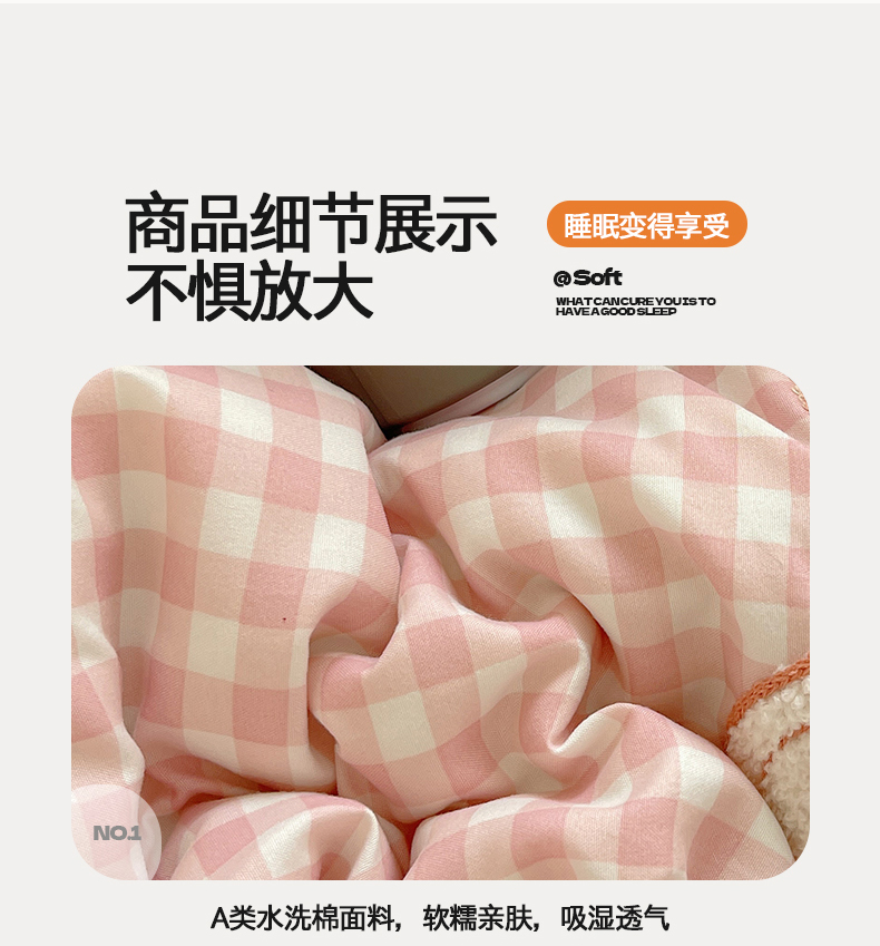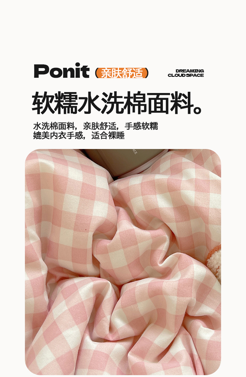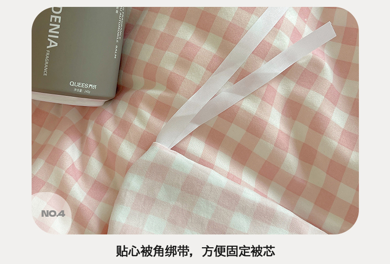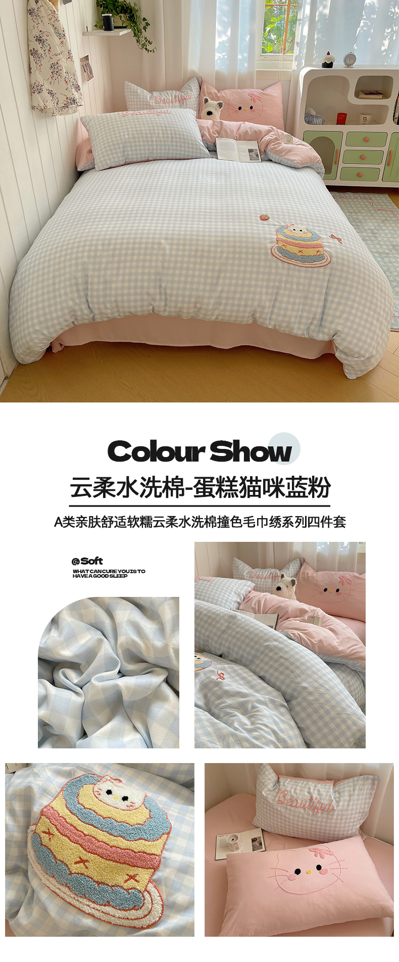 商品名称:(总)桃心家居 2025新款A类亲肤舒适软糯云柔水洗棉奶油格子撞色毛巾绣猫咪蝴蝶结水洗棉系列四件套