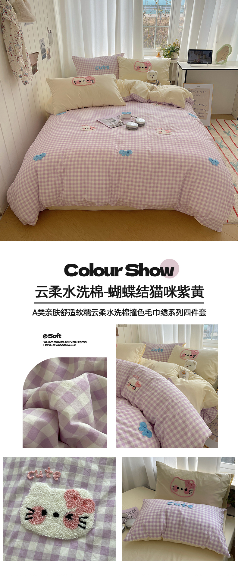 (总)桃心家居 2025新款A类亲肤舒适软糯云柔水洗棉奶油格子撞色毛巾绣猫咪蝴蝶结水洗棉系列四件套