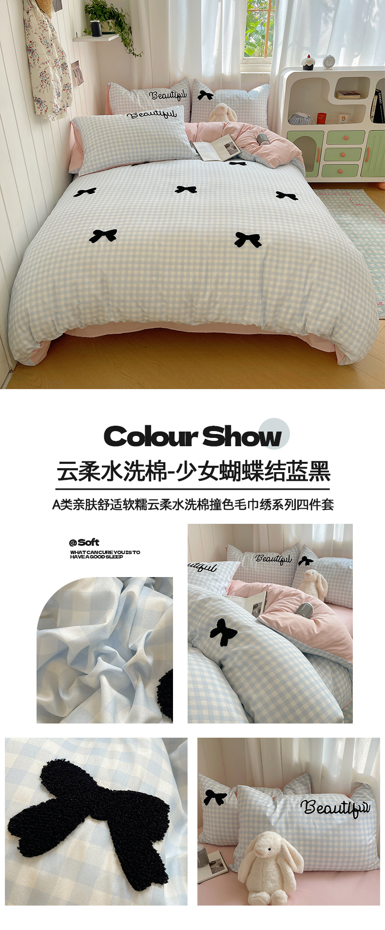 (总)桃心家居 2025新款A类亲肤舒适软糯云柔水洗棉毛巾绣奶油可爱蝴蝶结水洗棉系列四件套,云柔水洗棉-奶油蝴蝶结粉粉,云柔水洗棉-奶油蝴蝶结粉黑,云柔水洗棉-奶油蝴蝶结黄黑,云柔水洗棉-奶油蝴蝶结蓝黑,云柔水洗棉-奶油蝴蝶结蓝蓝,云柔水洗棉-奶油蝴蝶结绿绿