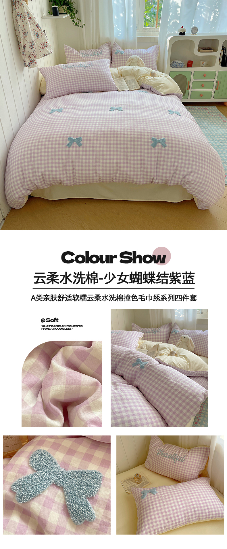 (总)桃心家居 2025新款A类韩系亲肤软糯甜格泡泡水洗棉撞色奶呼呼织标蝴蝶少女四件套,泡泡水洗棉-甜格白粉,泡泡水洗棉-甜格粉蓝,泡泡水洗棉-甜格奶白蓝,泡泡水洗棉-甜格奶咖,泡泡水洗棉-甜格紫黄,泡泡水洗棉-A甜格蓝黄