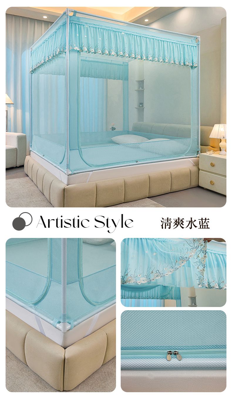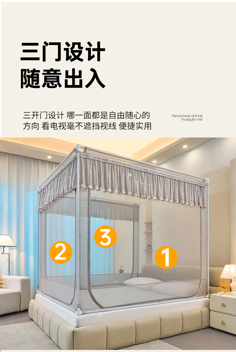 (总)2025新款双层花边全包围床笠款三开门蚊帐-幽梦星辰,奶黄,藕玉,颜淡蓝