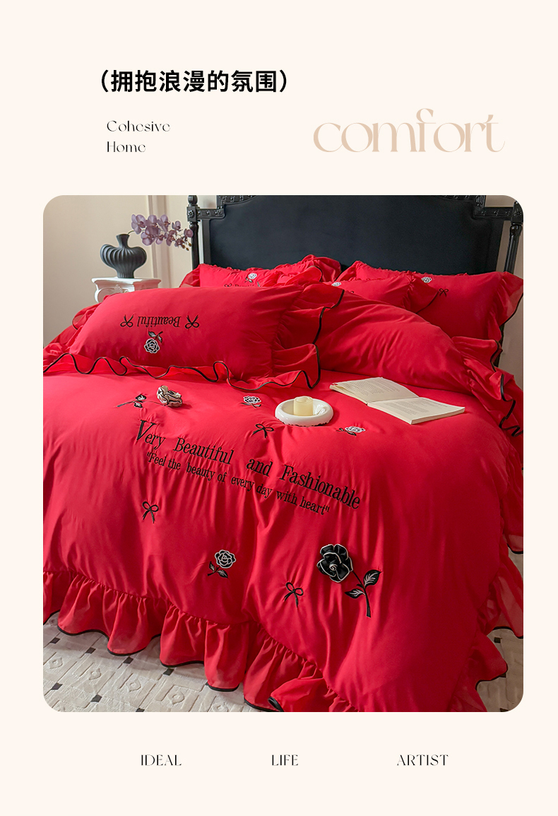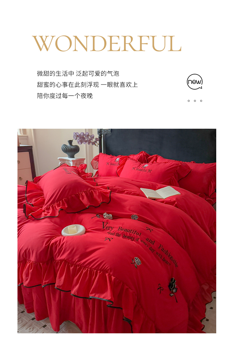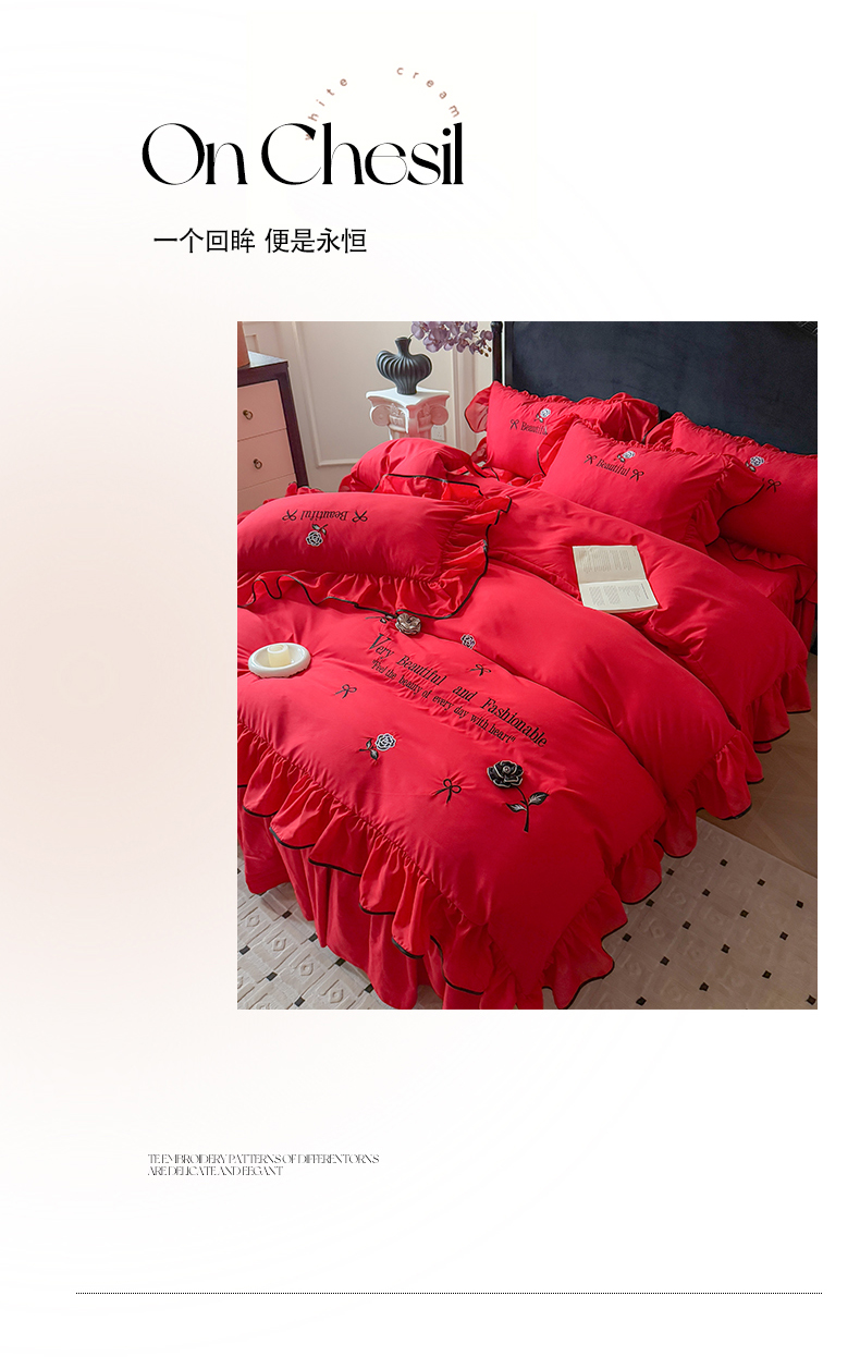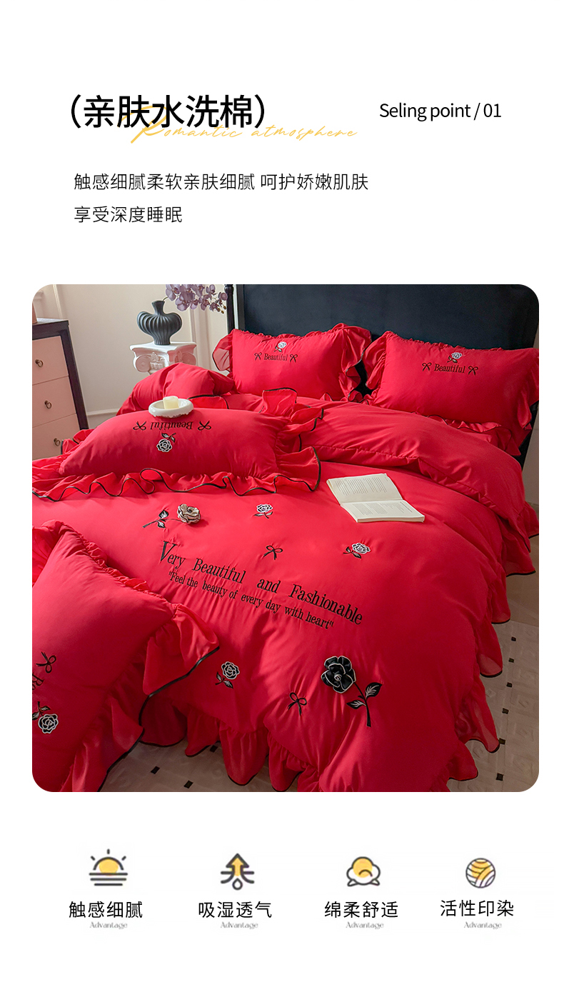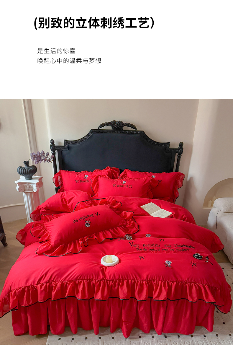 当前位置: 91家纺网 > 商品网购 > 床品套件 > 四件套 > 水洗棉四件套 > 富盛家纺 2025新款水洗亲肤棉刺绣床裙款四件套公主风四件套 茹意—大红