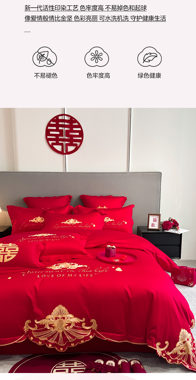 (总)欧乐蒂 2025新款亲肤棉刺绣花边婚庆四件套-倾城,倾城-金,倾城-喜红